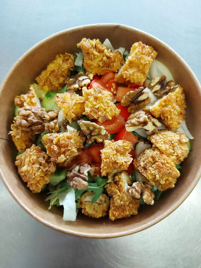 S2 – SALATĂ CU PUI CRISPY (pui crispy, fresh mix de salate, castravete, roșii) – 400 gr.