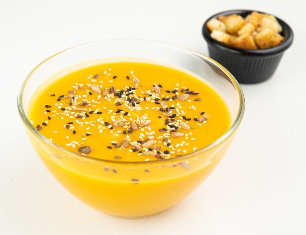 C2 – SUPĂ CREMĂ DE DOVLEAC CU CRUTOANE (dovleac, ceapa, morcovi, cartofi, smantana vegetala, crutoane) – 400 ml.