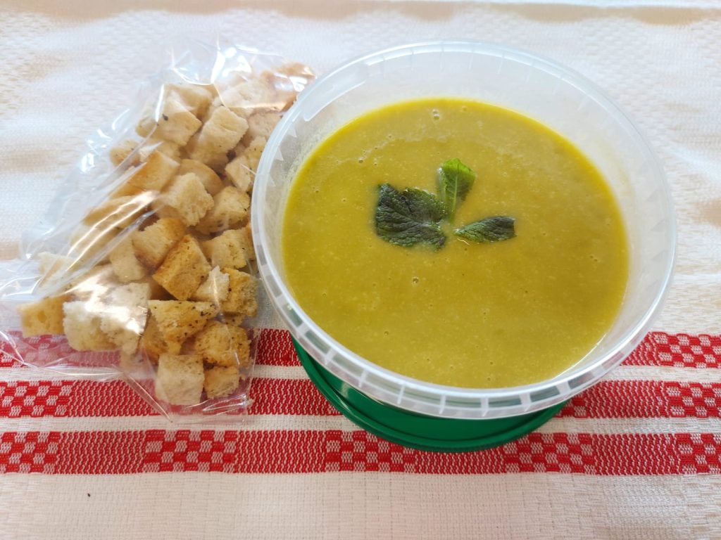 C2 – SUPĂ CREMĂ DE MAZARE VERDE CU MENTĂ ȘI CRUTOANE – DE POST (mazare, cartofi, ceapa, menta, smantana vegetala, crutoane) – 400ml.