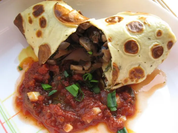 V1 – CLĂTITE CU CIUPERCI ȘI SOS DE ROȘII – DE POST (făină, ciuperci, ceapă, morcovi, sos de roșii) 350 gr.