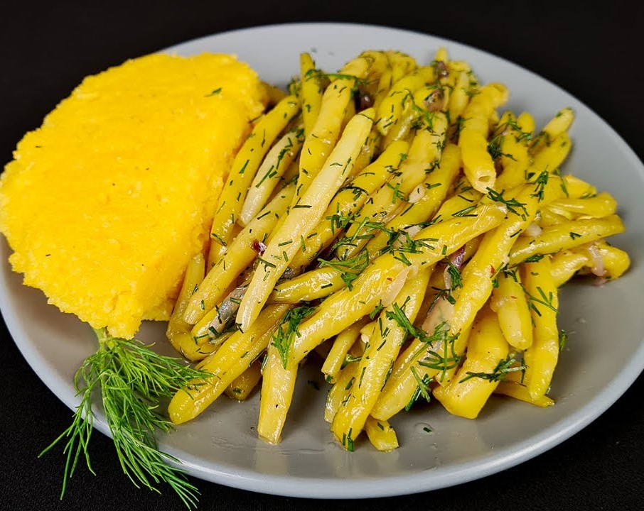 V1 – SOTE DE FASOLE VERDE CU USTUROI ȘI MĂMĂLIGUȚĂ (fasole verde, ceapă, usturoi, roșii decojite, făină de mălai) 350 gr.