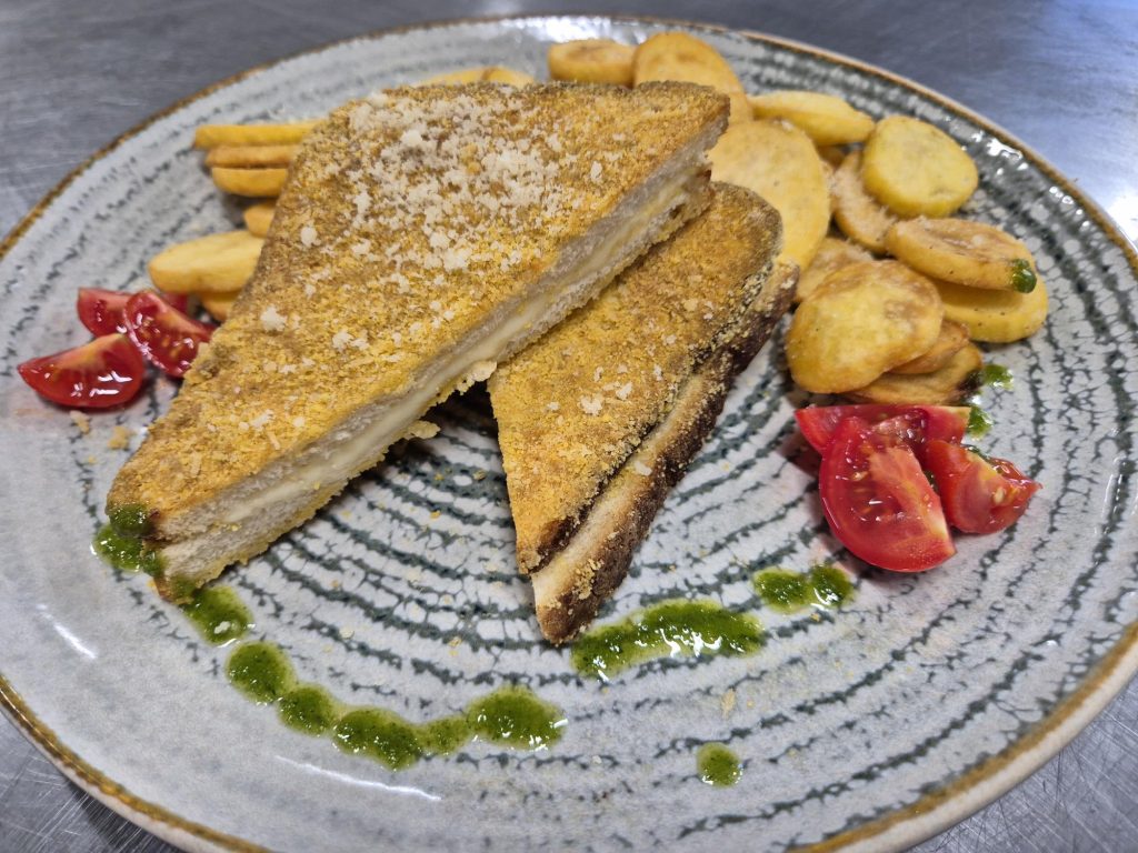 V1 – SANDWICH TOAST CU MOZZARELLA ȘI CARTOFI PRĂJIȚI / MOZZARELLA IN CARROZZA (pâine toast, ou, mozzarella, sos rosii, cartofi prajiti) – 350 gr.