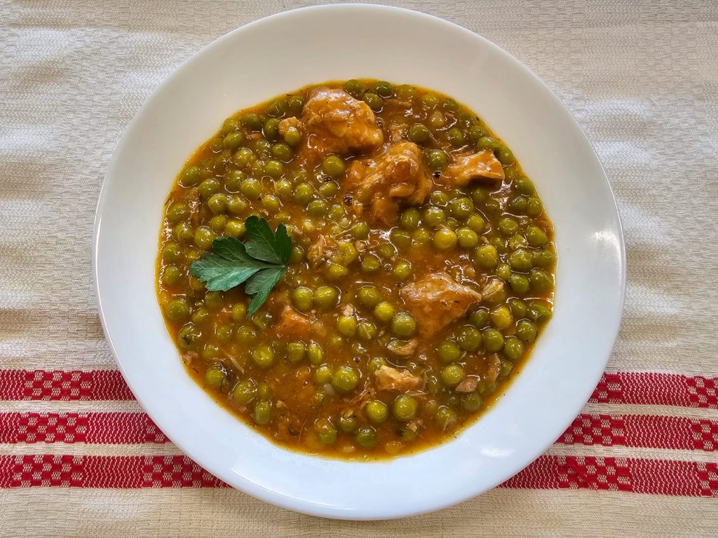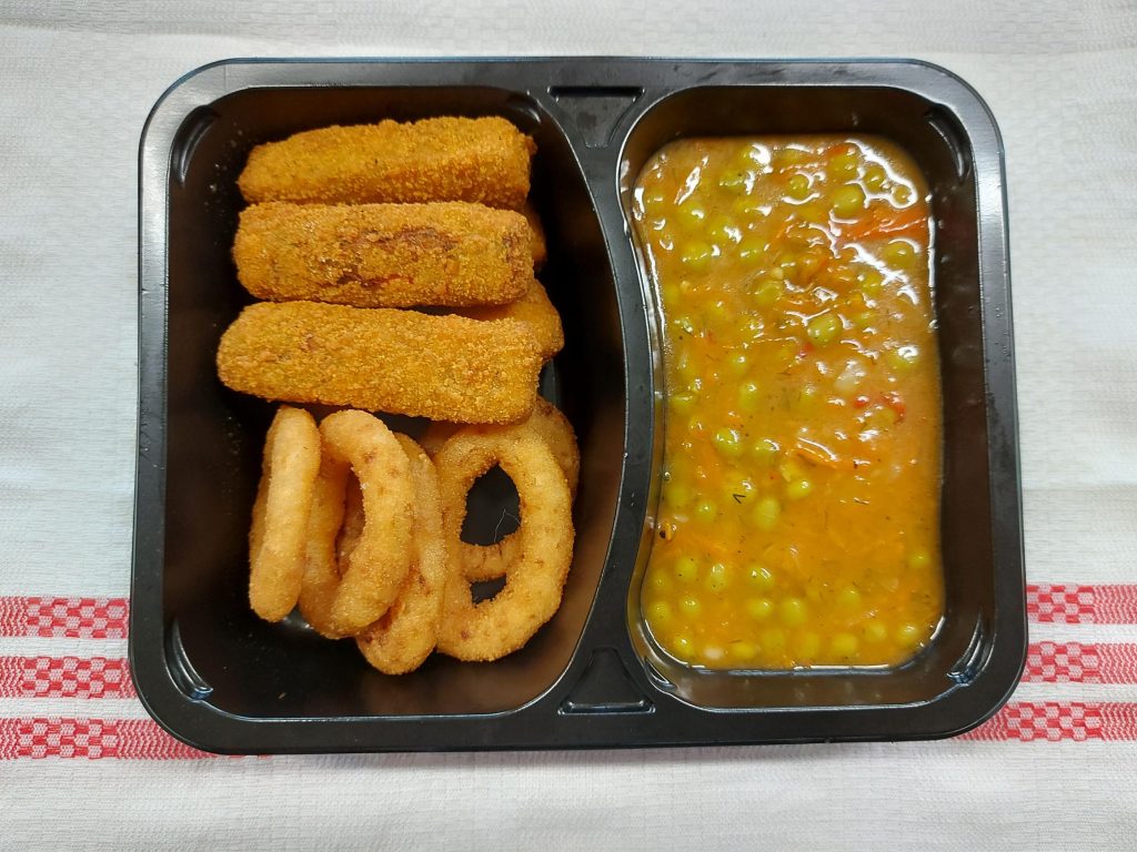 V1 – MAZĂRE SCĂZUTĂ CU ȘNIȚEL VEGETAL (mazare, soia, ceapa, morcovi, ardei, faina, smantana vegetala, pesmet) 350 gr.