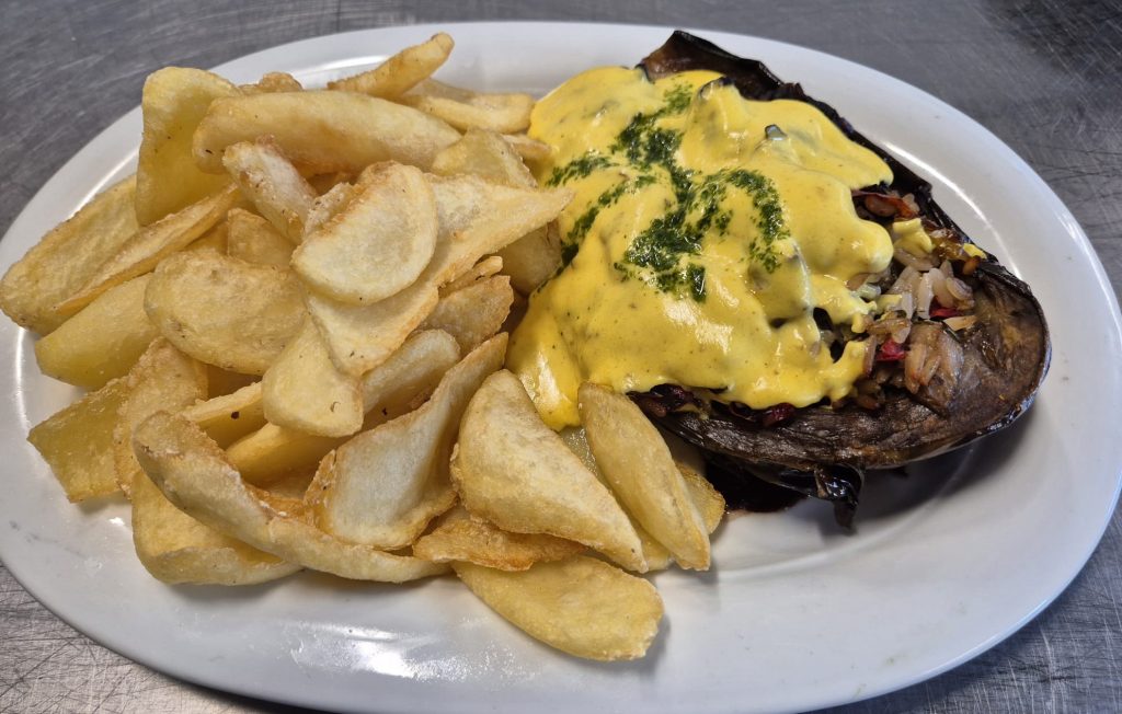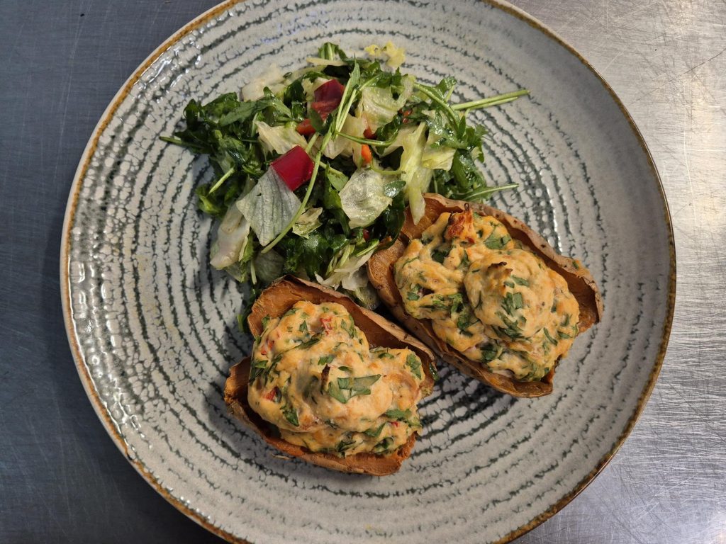 V1 – CARTOFI DULCI UMPLUȚI CU LEGUME (cartofi dulci, dovlecel, vinete, ardei, orez, cașcaval, sos chimichurri) 350 gr