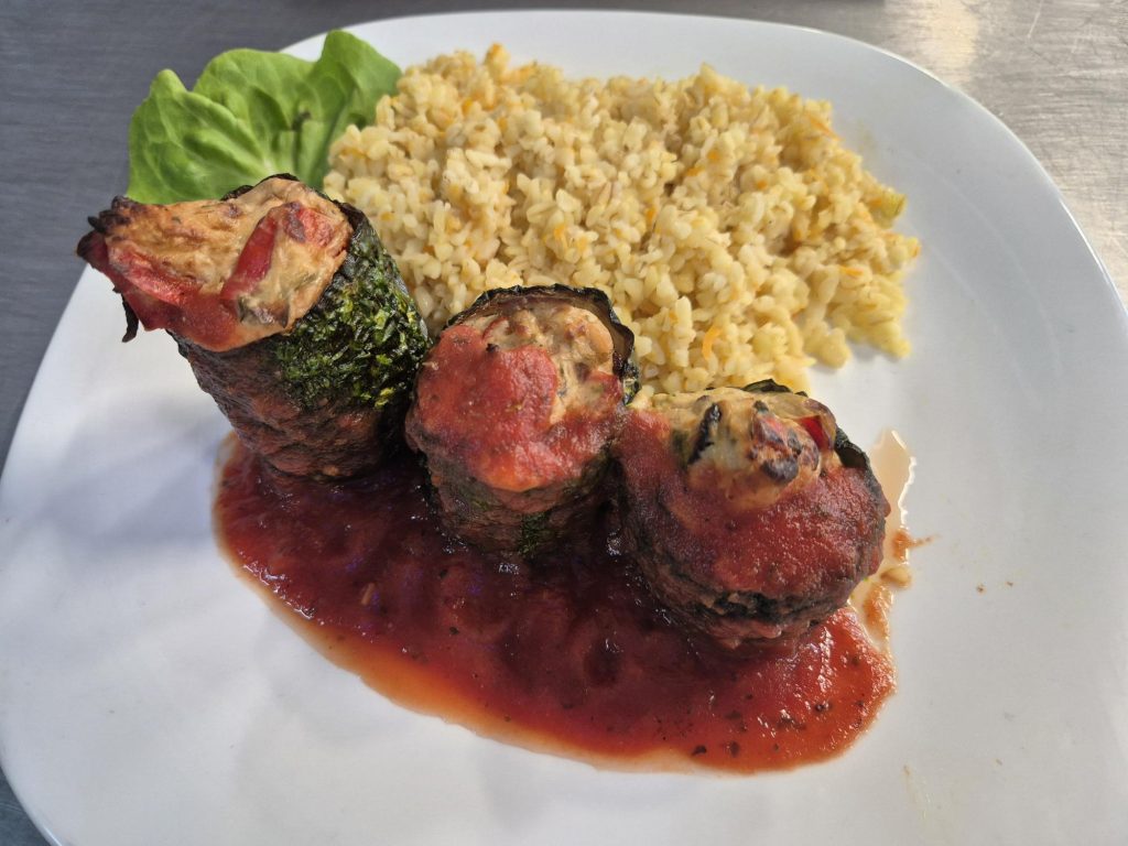 V1 – DOVLECEI UMPLUȚI ȘI PILAF DE BULGUR CU SOS DE ROȘII ( dovlecel, feta, ardei, ceapa, morcovi, ou, bulgur, bulion) 350 gr.