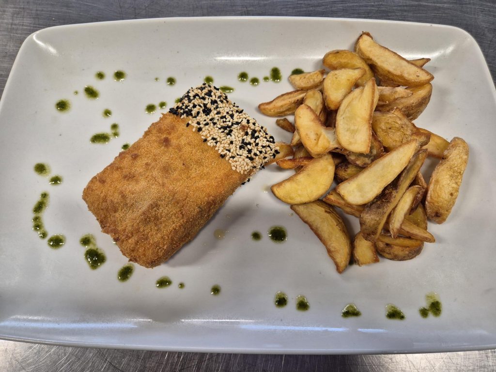 V1 – MOZZARELLA PANE ÎN CRUSTĂ DE SUSAN CU CARTOFI WEDGES (mozzarella, pesmet, făină, ouă, semințe de susan, cartofi wedges) 350 gr.
