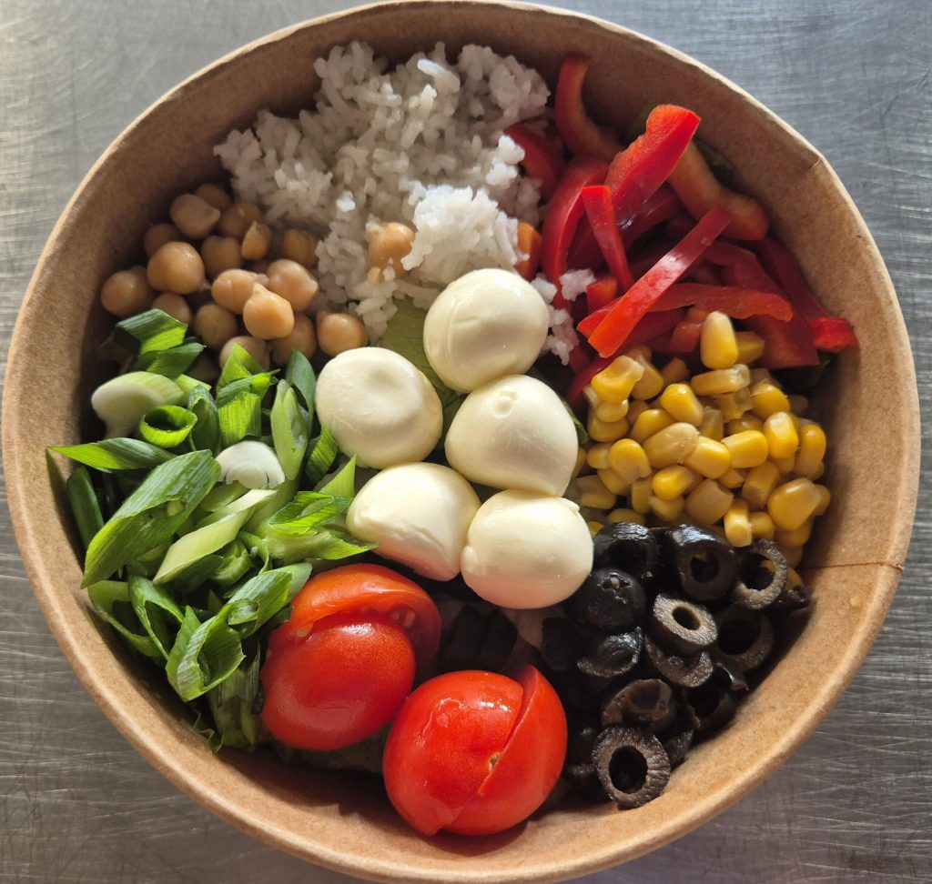 V1 – SALATĂ DE NĂUT CU OREZ BASMATI ȘI MOZZARELLINE (salata verde, naut, orez, ceapa verde, ardei, porumb, masline, bile de mozzarella, dressing) 350 gr.
