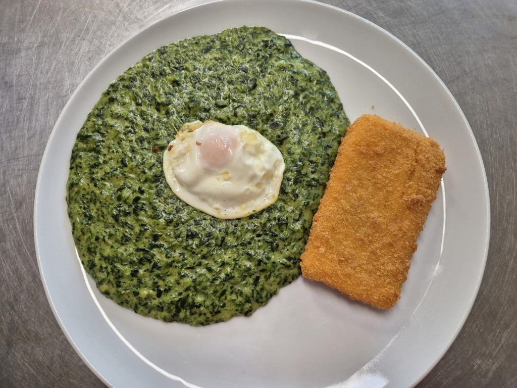 V1 – SPANAC CU OCHIURI ȘI CAȘ PANE (spanac, lapte, făina, ou, cașcaval, pesmet) 350 gr.