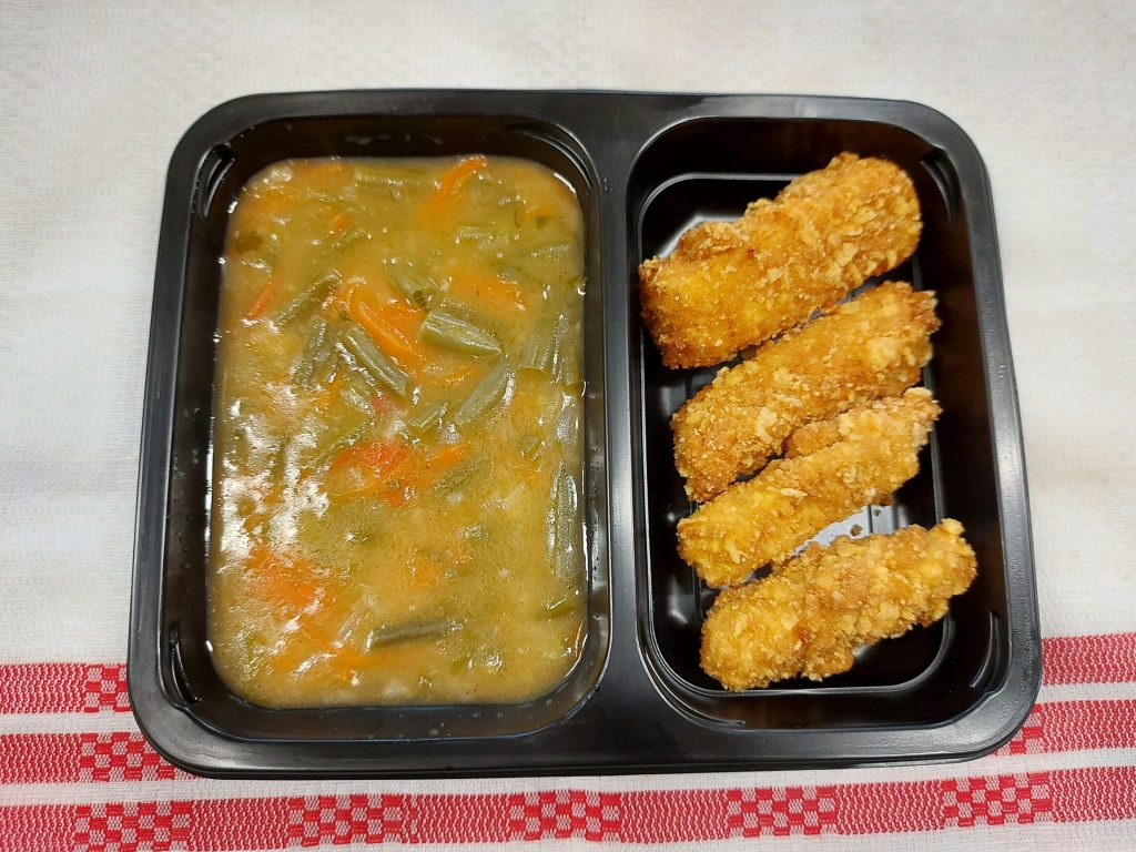 V1- FASOLE VERDE SCĂZUTĂ CU CRISPY DE DOVLECEL (dovlecel, ou, pesmet, fasole verde, morcovi, făină, lapte) 350 gr.
