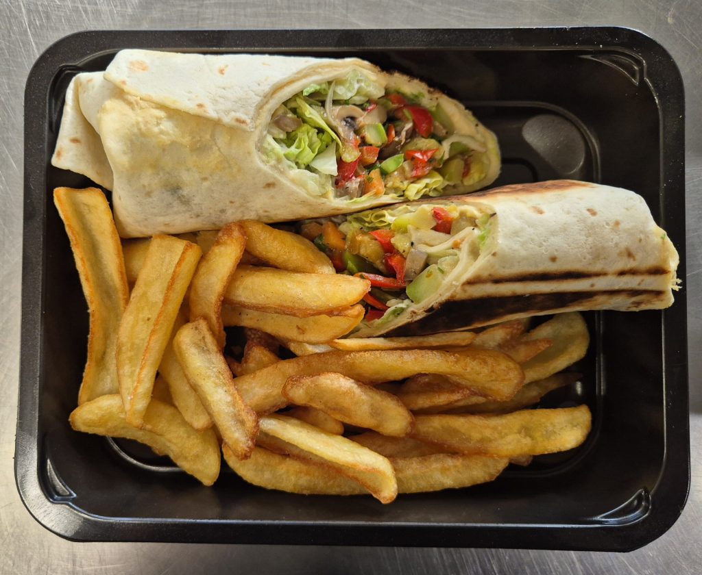 V1 – WRAP CU LEGUME LA GRĂTAR, HUMUS ȘI CARTOFI PRĂJIȚI – DE POST (ardei gras, dovlecel, ciuperci, naut, tahini, lamaie, ulei de masline, cartofi, usturoi, lipie) – 350 gr.