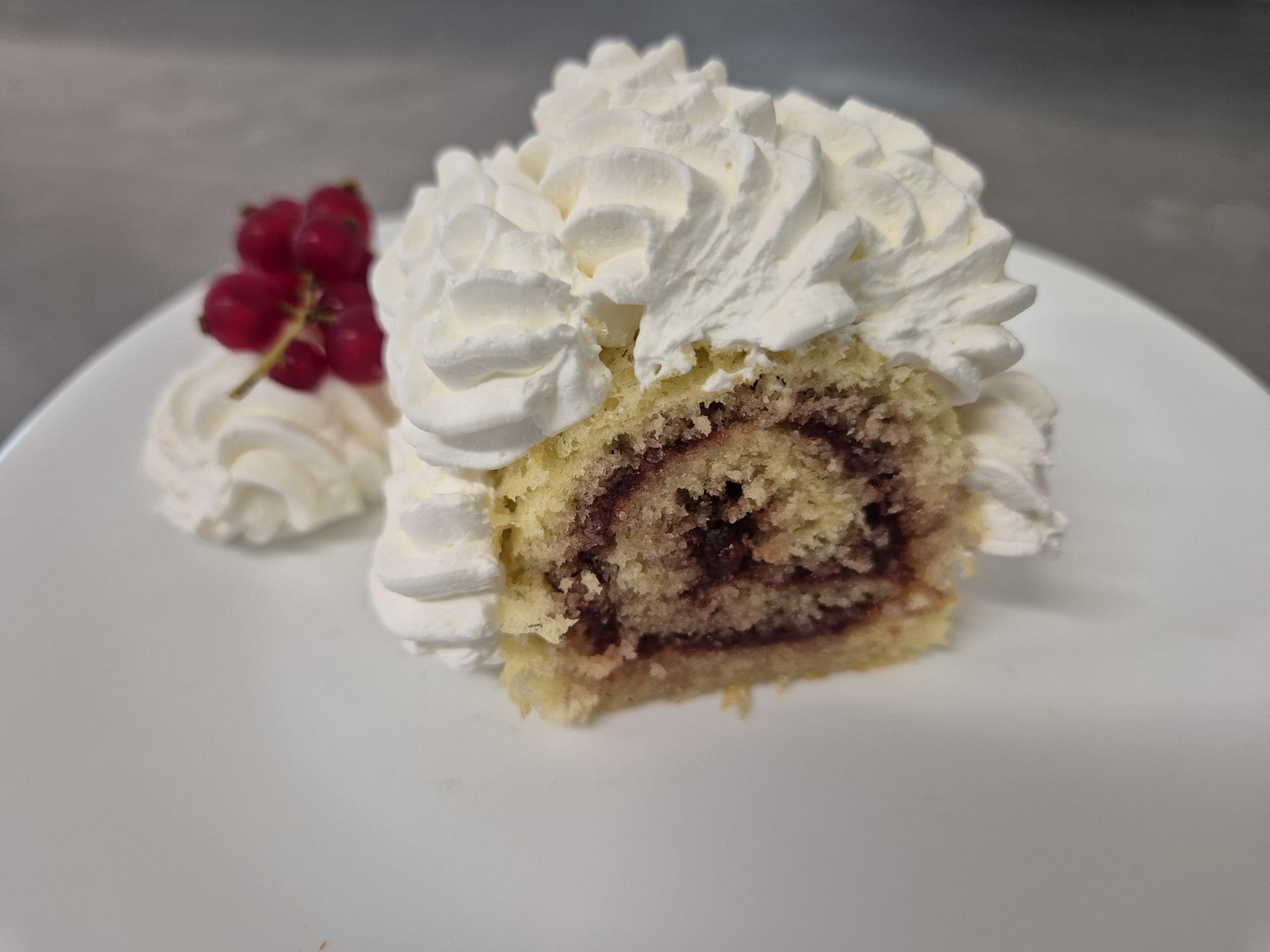D1 – RULADĂ CU DULCEAȚĂ DE CĂPȘUNI ȘI FRIȘCĂ (făină, zahăr, ouă, ulei, dulceață de căpșuni, frișcă) 150 gr.