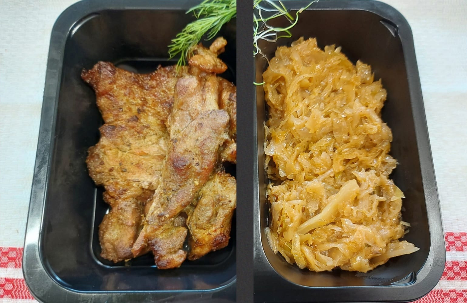 F1 – CEAFĂ DE PORC LA CUPTOR CU VARZĂ CĂLITĂ (ceafă de porc, untură, usturoi, varză, boia) – 350 gr.