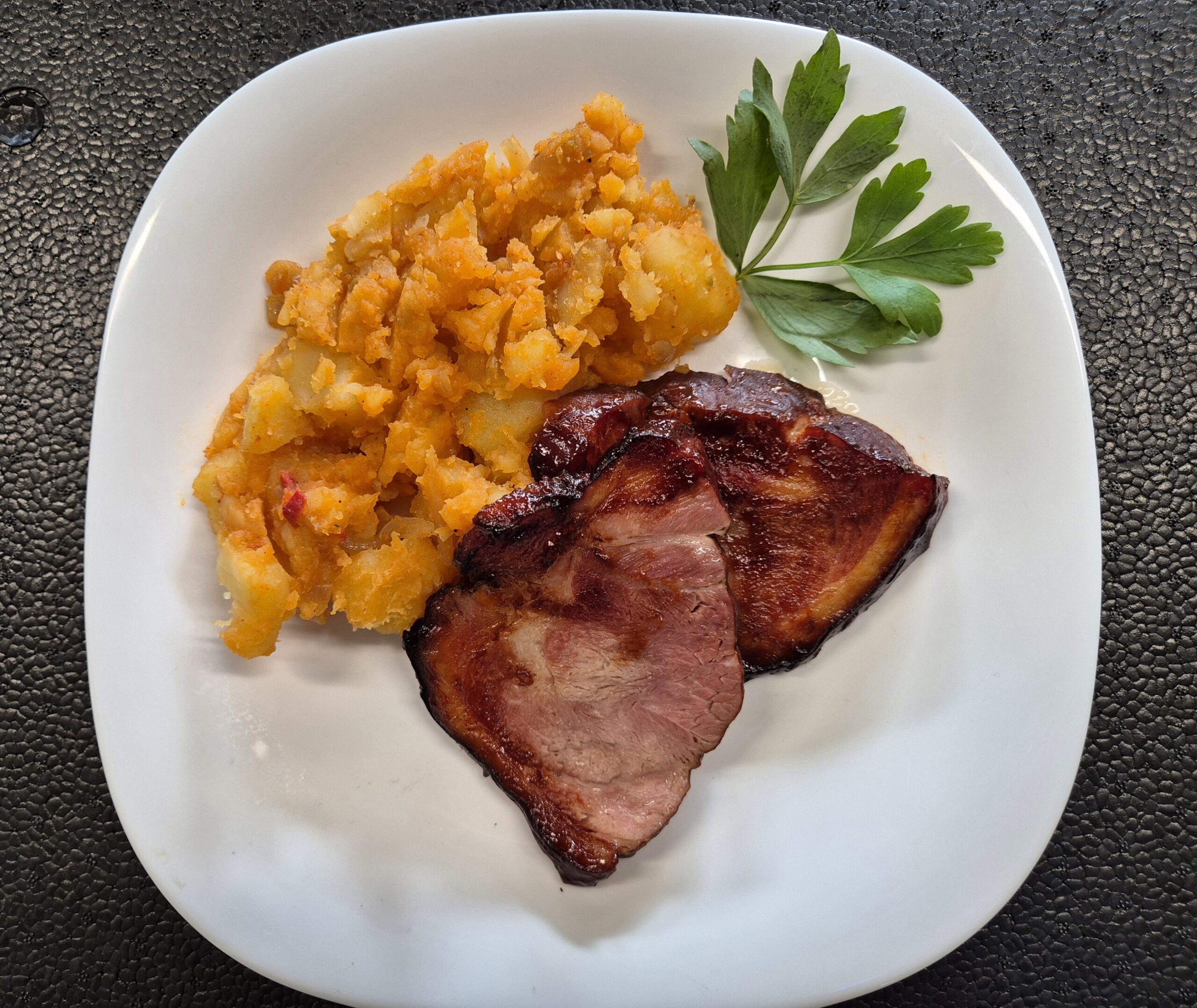 F1 – CIOLAN AFUMAT LA CUPTOR CU CARTOFI RĂNTĂLIȚI (ciolan, sos bbq, cartofi, ceapa, ardei, boia) 350 gr.