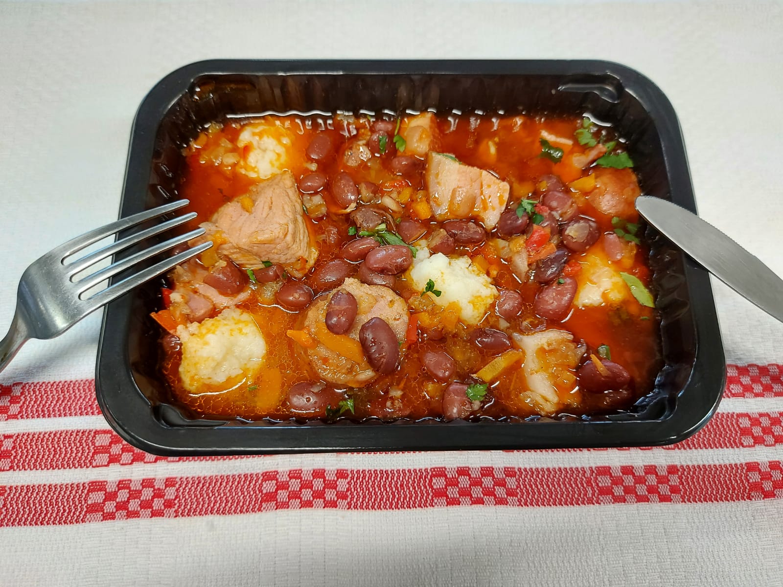 F1 – GULAȘ DE PORC CU FASOLE BOABE – BOB GULYAS (carne de porc, carnati, fasole boabe, faina, ou, ceapa, ardei, chimen, boia) – 350 gr.