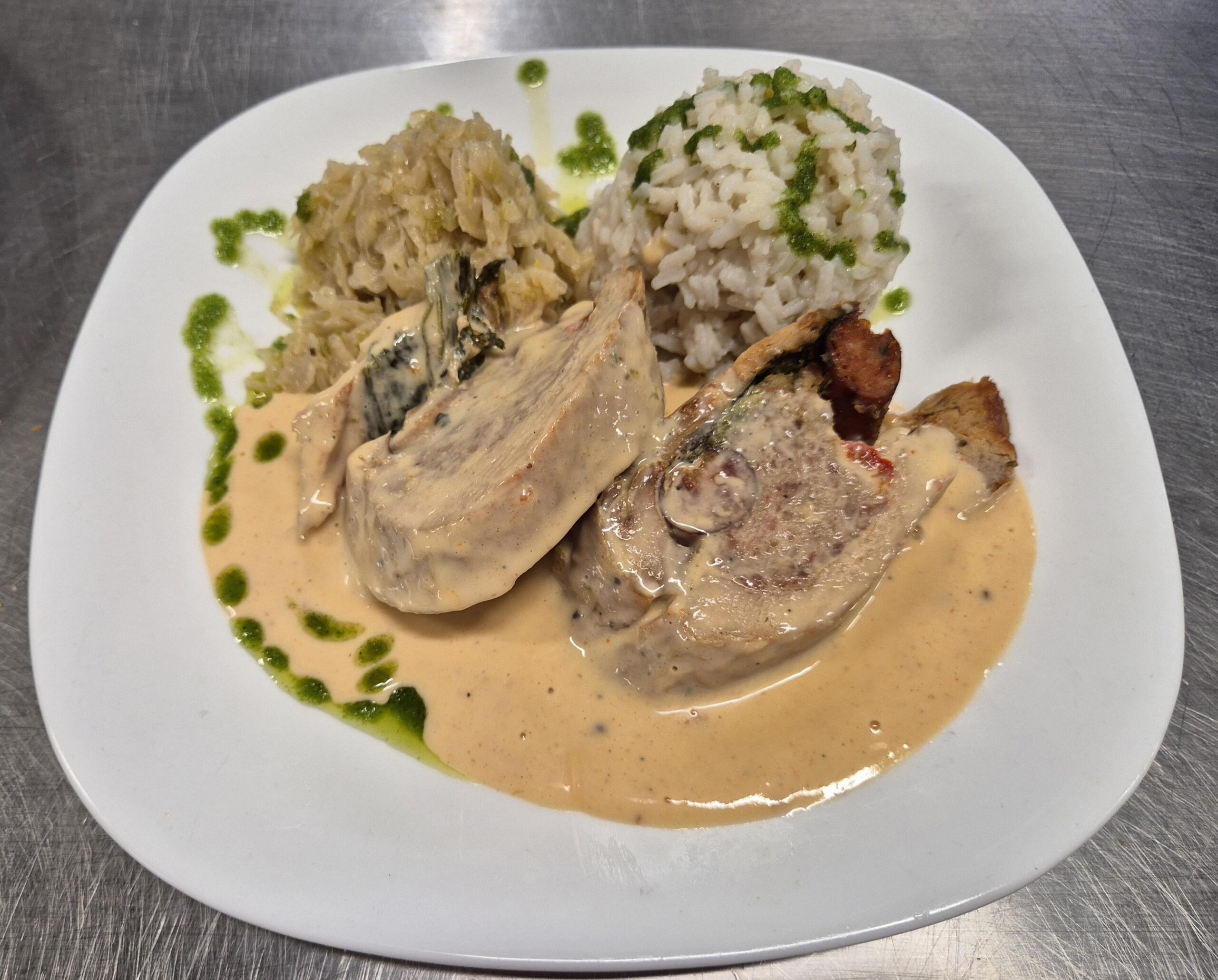 F1 – RULADĂ DE PORC CU VARZĂ CĂLITĂ ȘI OREZ (cotlet porc, carnaciori, ardei, varza, orez) 350 gr.