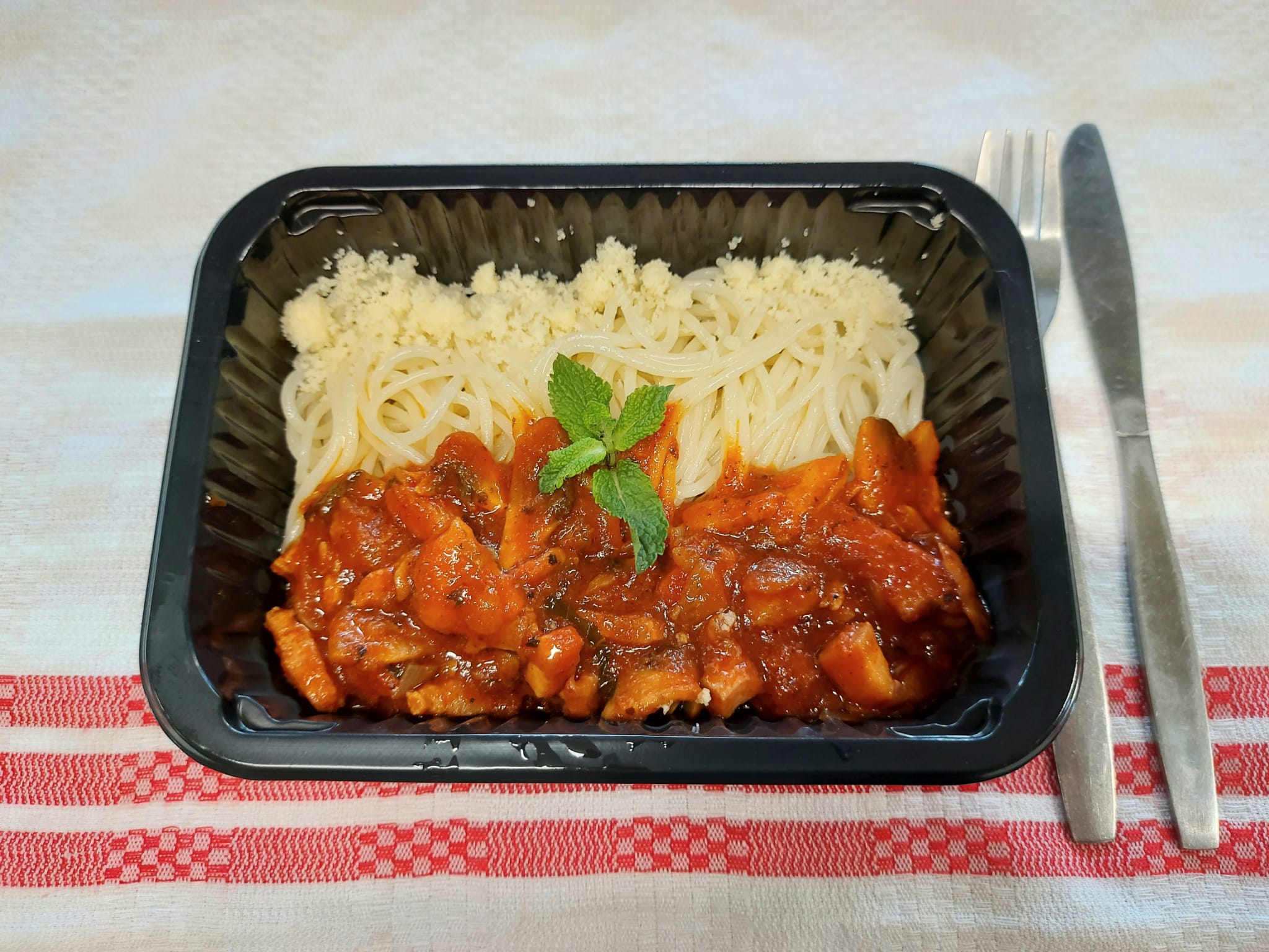 F1 – SPAGHETTI MILANESE (bacon, ciuperci, roșii, usturoi, ceapă, oregano, busuioc, parmesan, spaghetti) 350 gr.