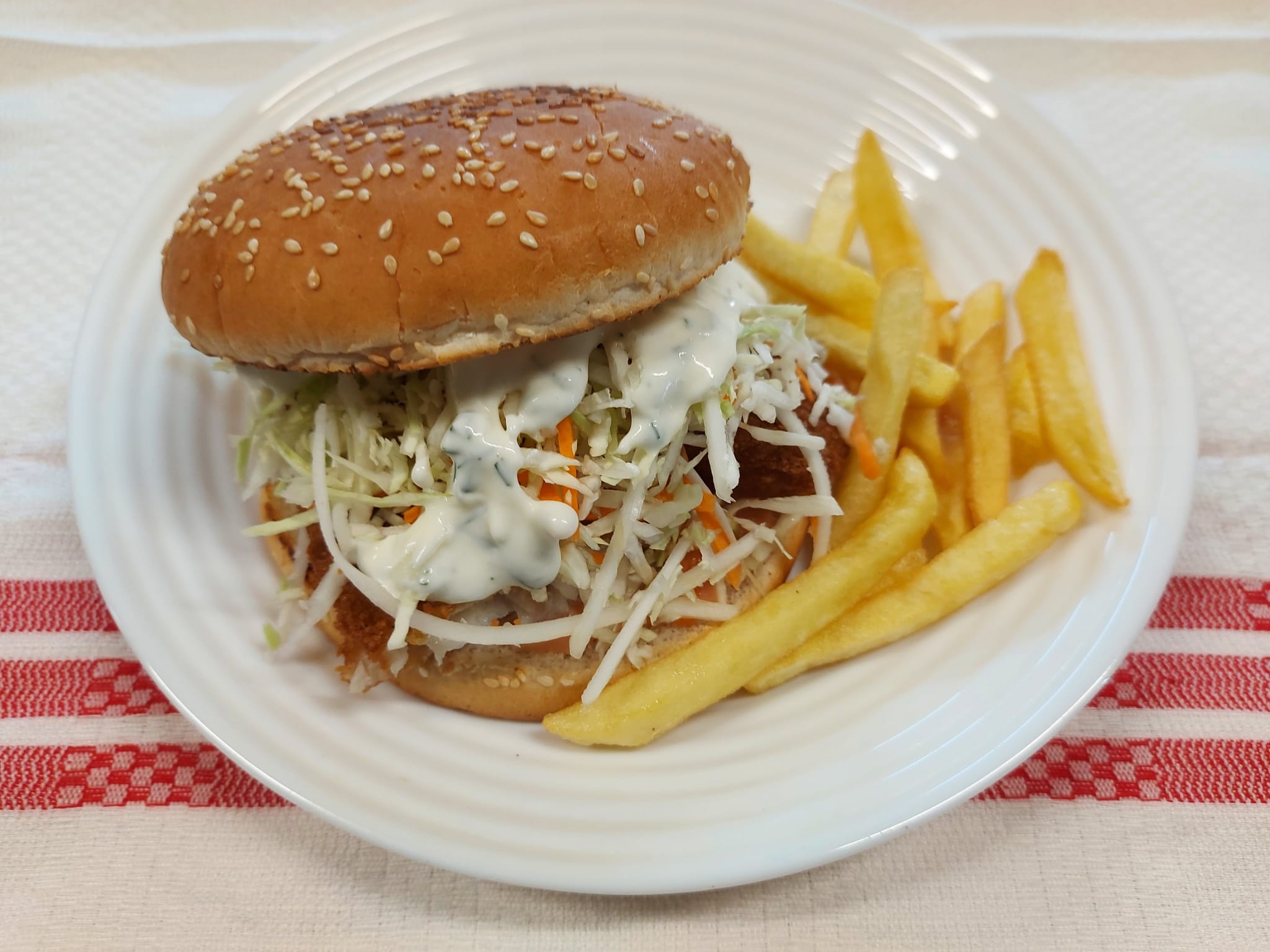 F2 – BURGER CU PUI ROTISAT, BRANZA CHEDDAR ȘI CARTOFI PRAJIȚI (carne de pui, chifla burger, boia, usturoi, varza, rosii, castraveti, branza cheddar, cartofi prajiti, sos de maioneza si ketchup) – 350gr.