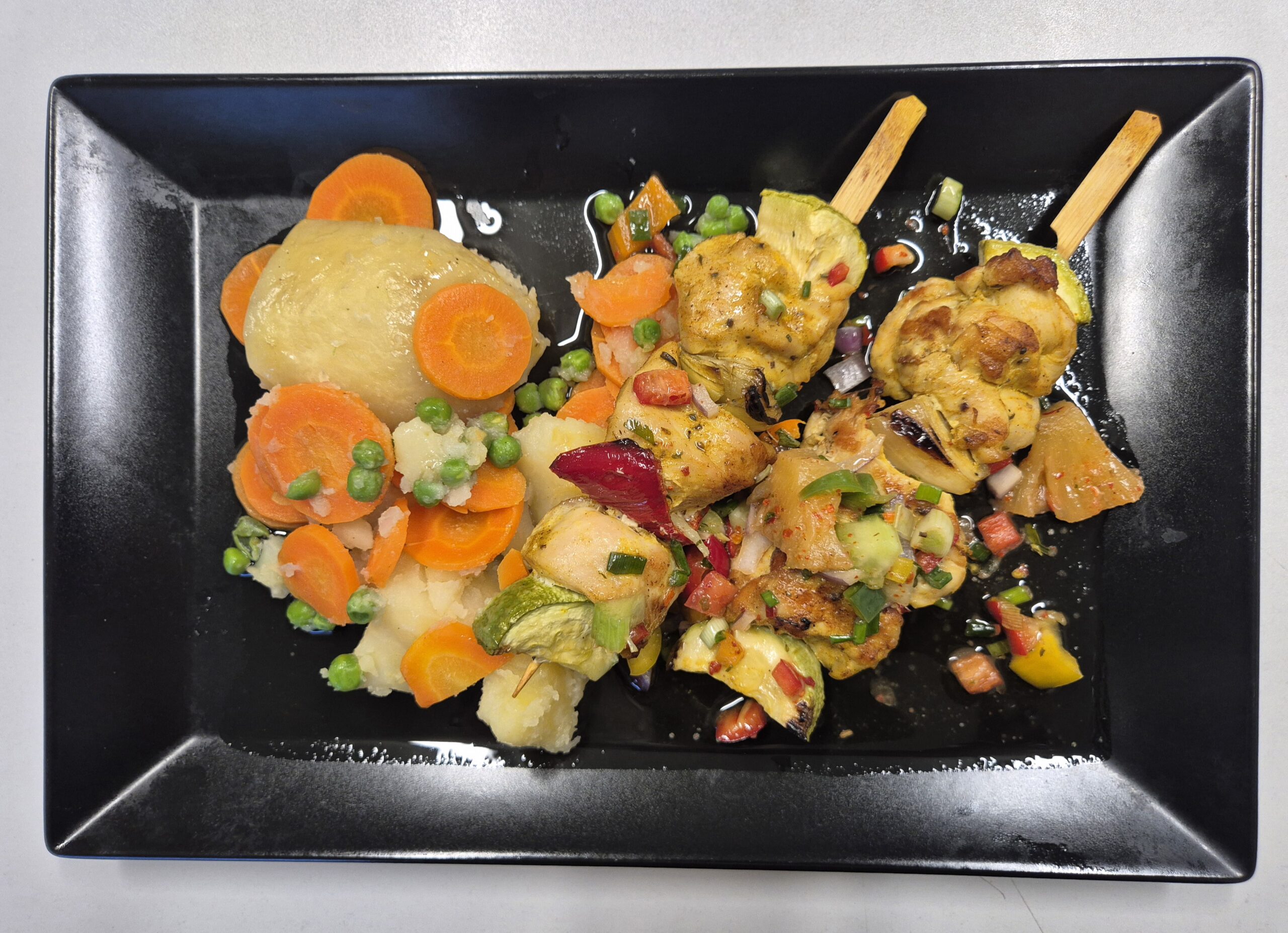 F2 – FRIGĂRUI DE PUI BBQ CU ASORTIMENT DE MAZĂRE ȘI MORCOVI (carne de pui, ceapă, dovlecel, roșie, sos bbq, mazare, morcovi, cartofi) 350 gr.
