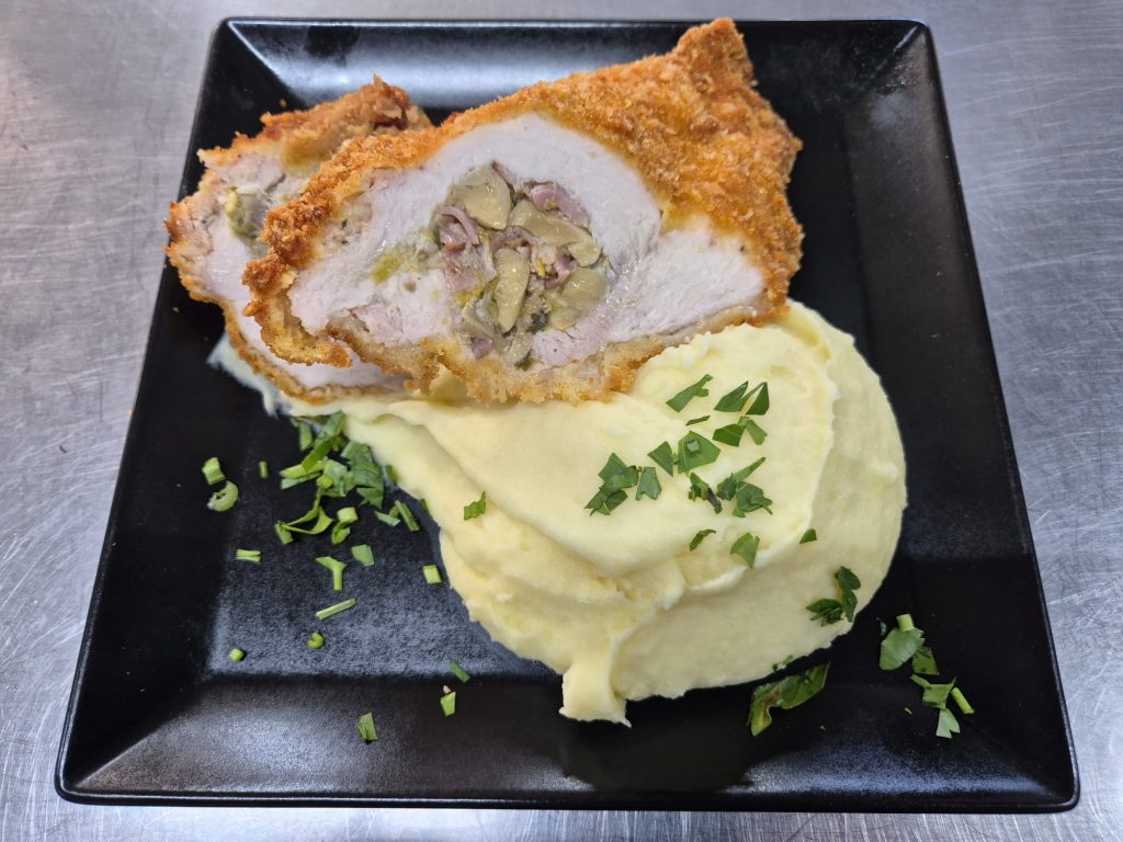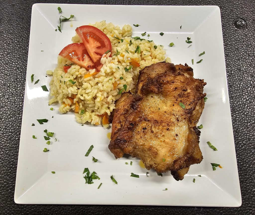 F2 – FRIPTURA DIN PIEPT DE PUI CU SOS DEMIGLACE SI OREZ CREMOS (piept de pui, ceapa, usturoi, ardei, sos demiglace, orez, ceapa, parmezan, smantana vegetala) 350 gr.