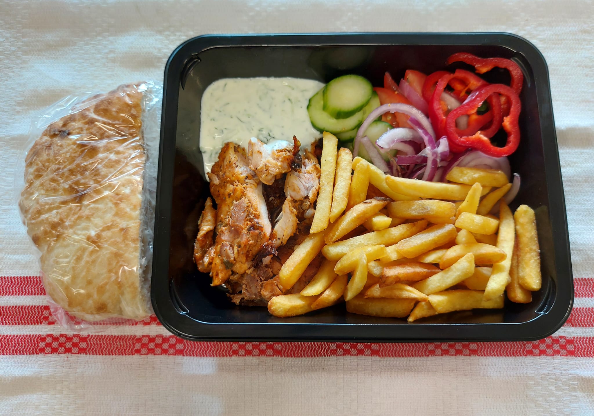 F2 – GYROS DE PUI CU CARTOFI DIPPERS ȘI PITTA (carne de pui, roșii, ceapă roșie, cartofi, roșii, lămâie, usturoi, boia, oregano, sos tzatziki, pitta) – 350 gr.