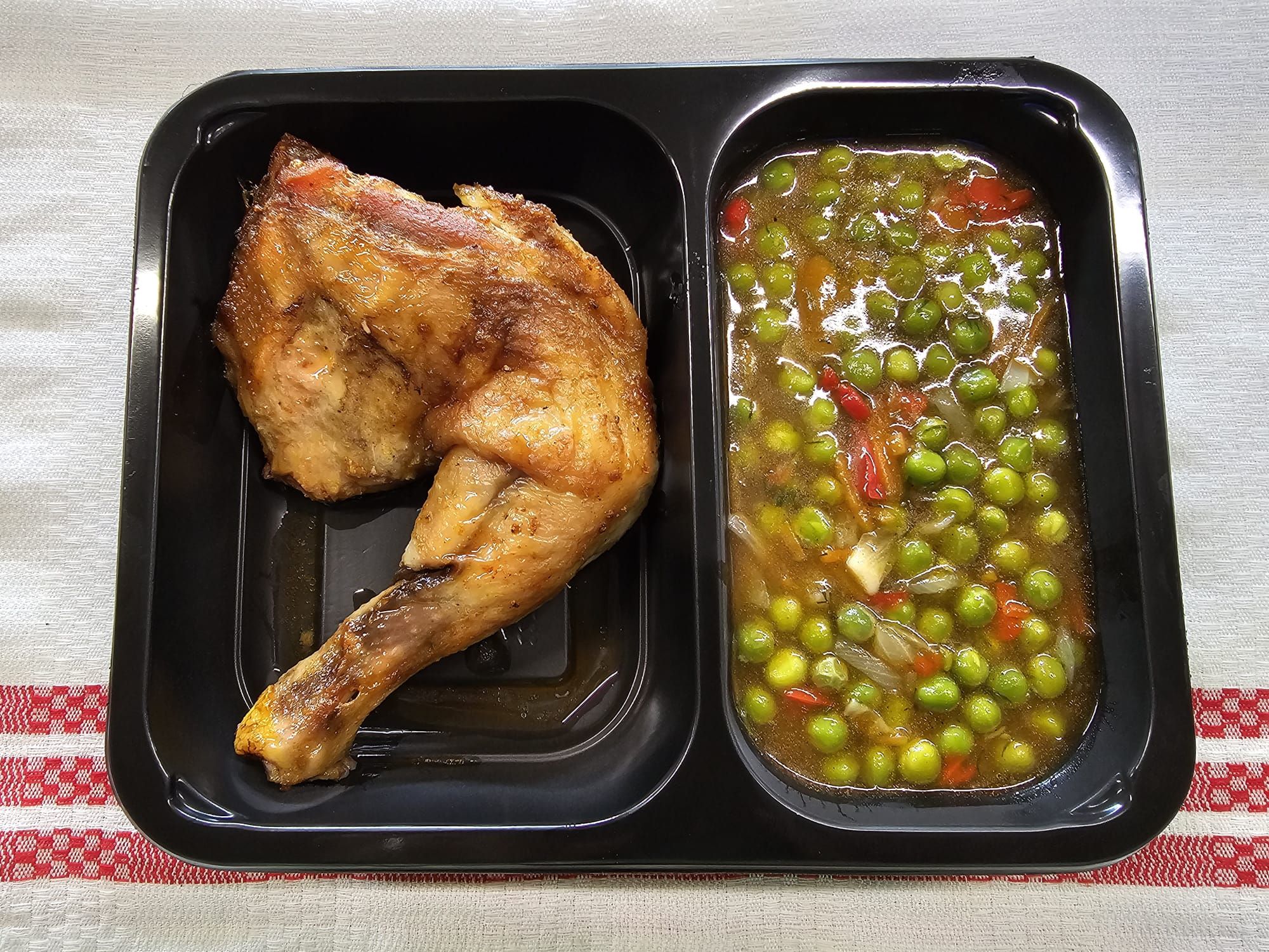 F2 – MÂNCARE DE MAZĂRE CU PULPE DE PUI (pulpă de pui, mazăre, morcovi, ceapă, țelină, usturoi, făină, roșii) 350gr.
