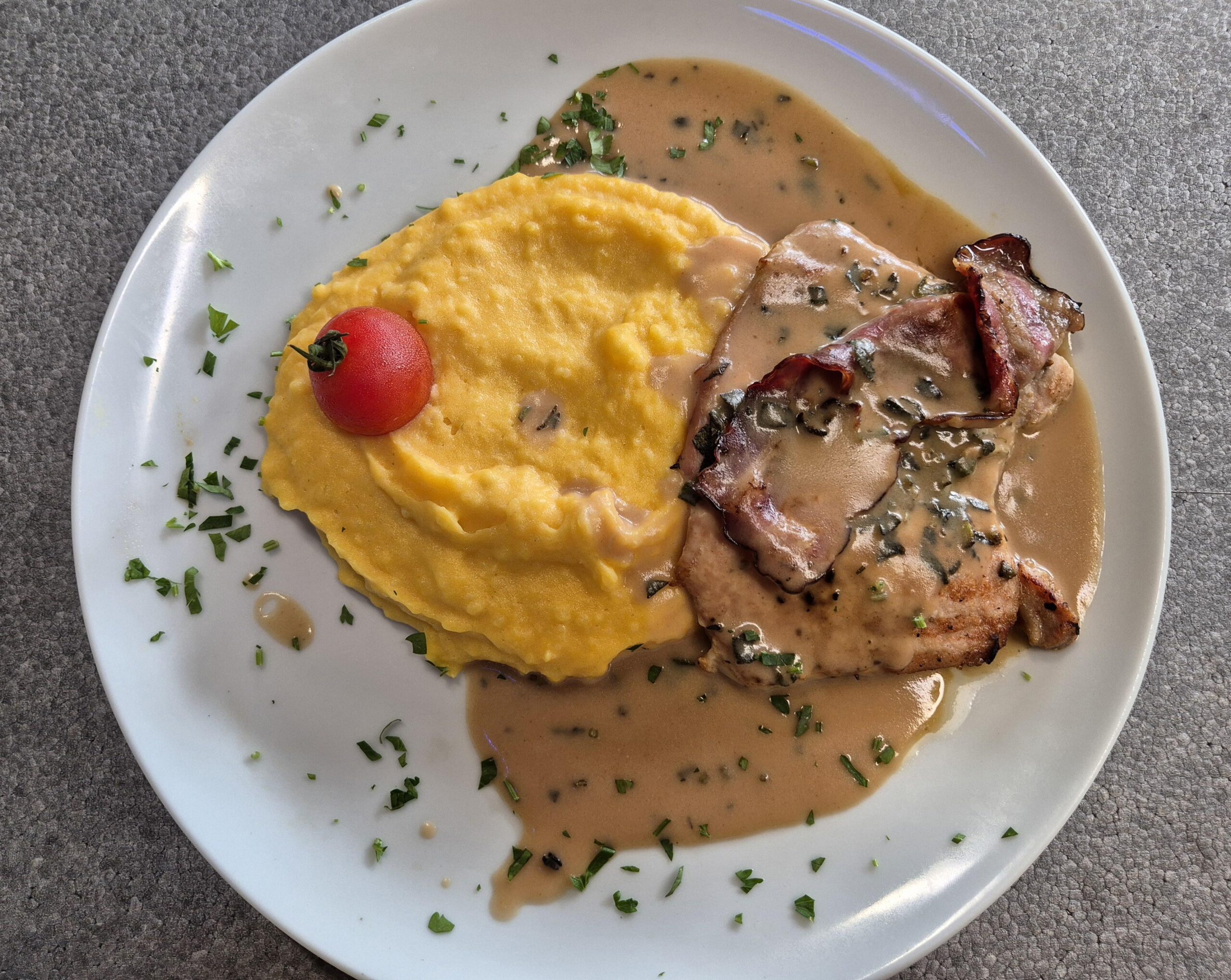 F2 – PIEPT DE CURCAN LA CUPTOR CU SOS DE FRUCTE DE PĂDURE ȘI PIURE DE CARTOFI (piept de curcan, usturoi, cartofi, lapte, unt, fructe de pădure, vin, zahăr) 350 gr.