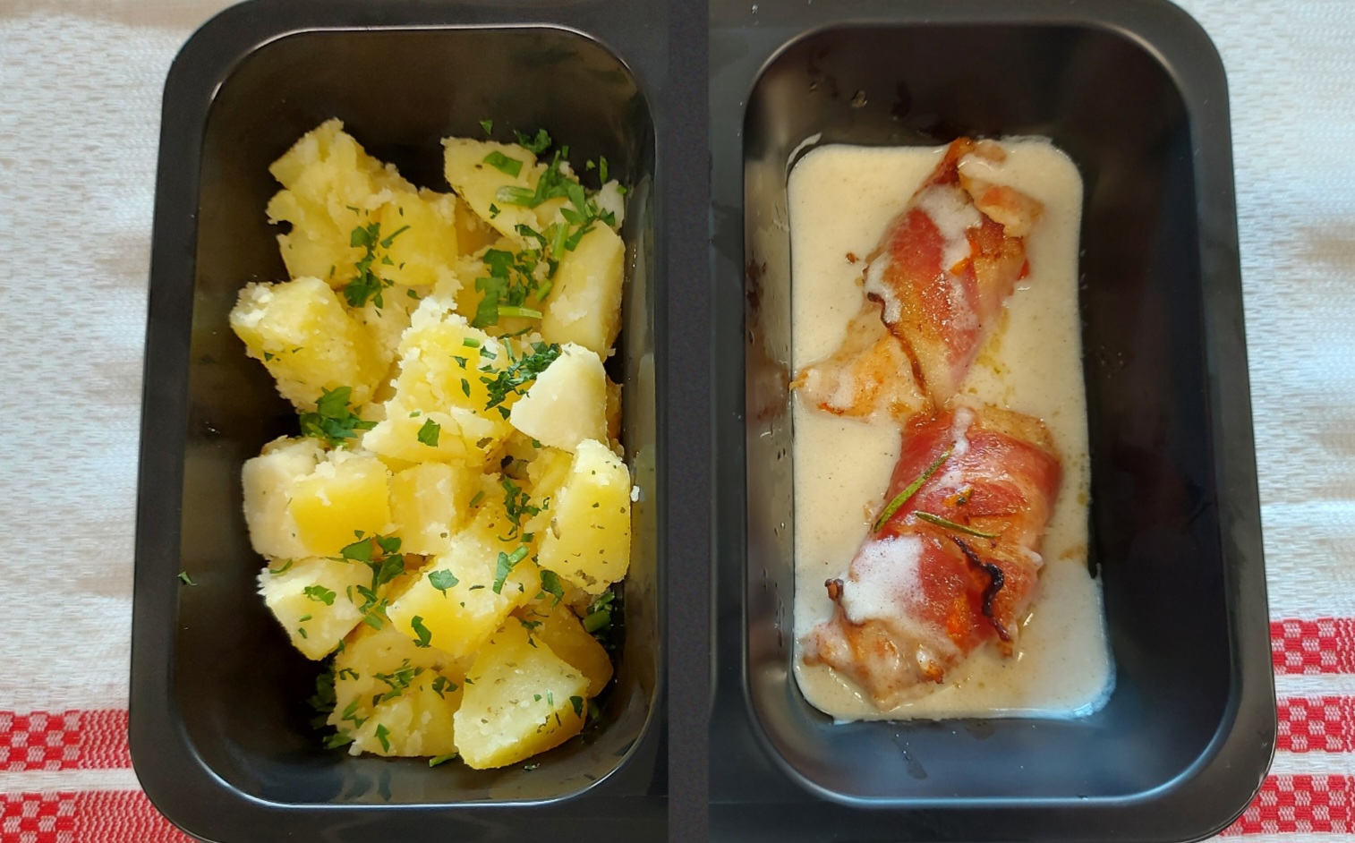 F2 – PIEPT DE PUI INVELIT IN BACON CU SOS DE PRAZ SI CARTOFI NATUR (piept de pui,bacon, praz,smantana, nucsoara, faina, cartofi, unt, patrunjel) 350 gr.