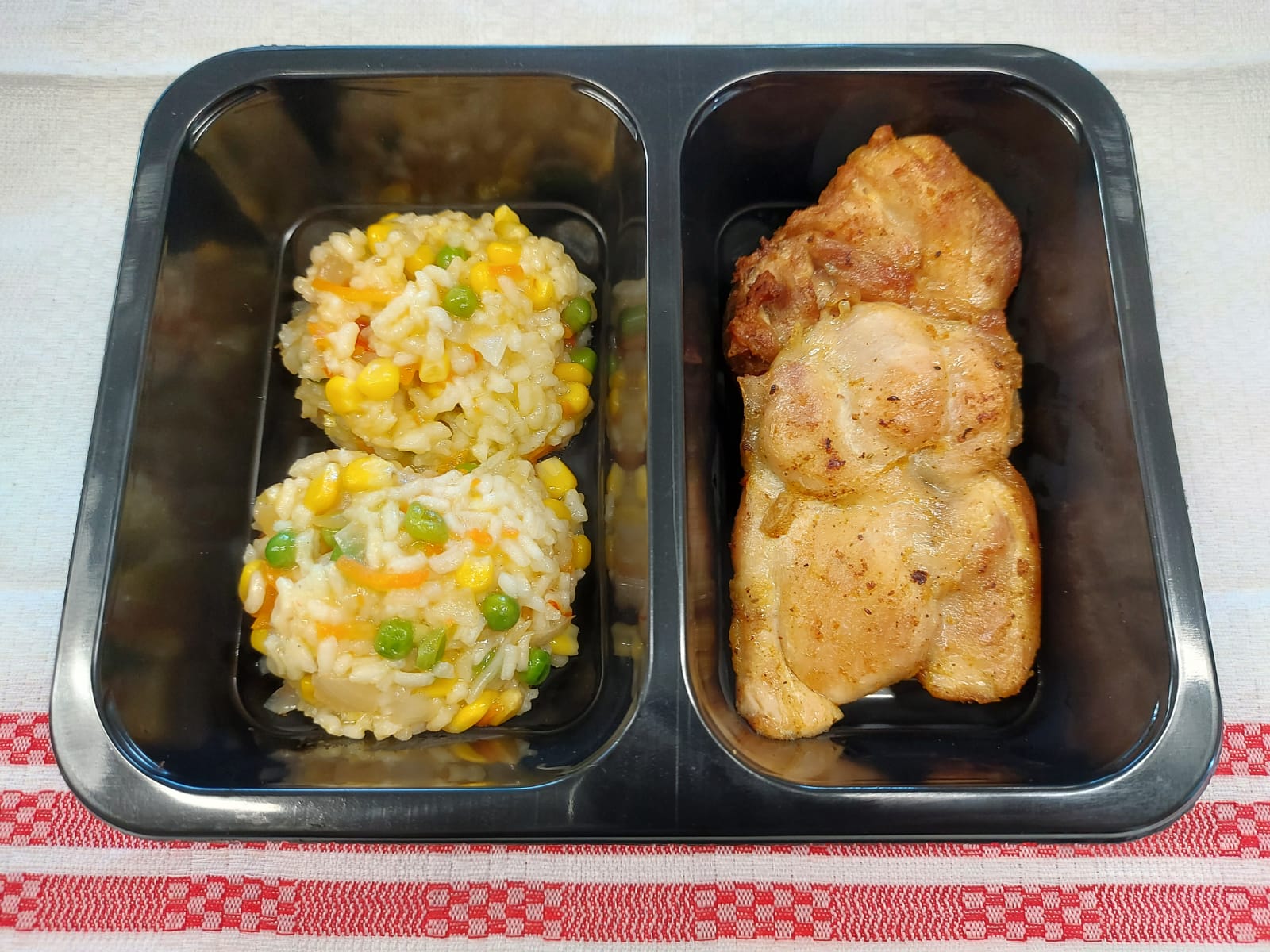 F2 – PULPE DE PUI MARINATE LA GRĂTAR ȘI OREZ CU MAZĂRE ȘI PORUMB (piept de pui, usturoi, orez, mazăre, porumb, ceapă, morcovi) 350 gr.