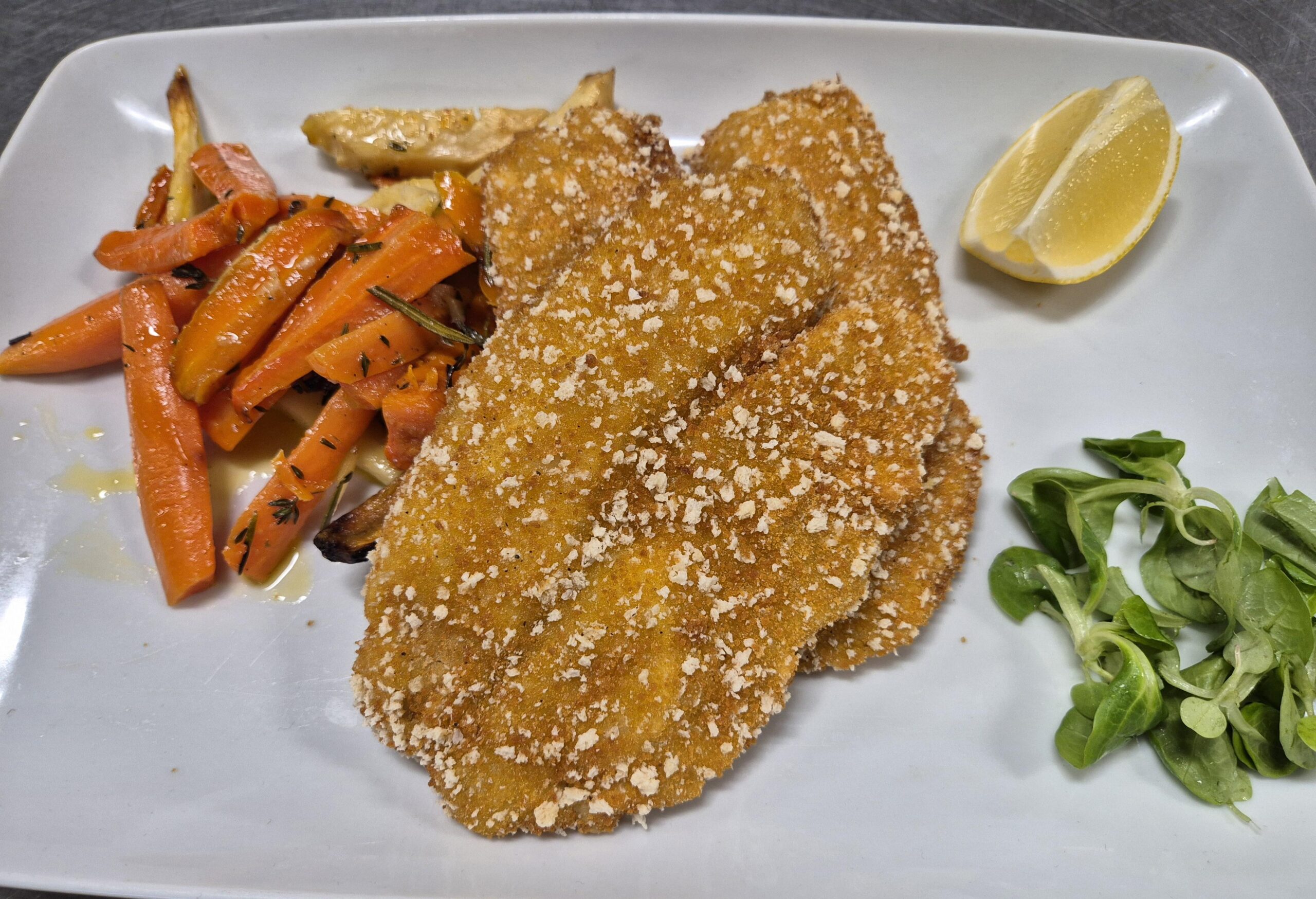 F3 – DEZLEGARE LA PEȘTE – FILE DE ȘALĂU PANE CU LEGUME CARAMELIZATE ȘI LĂMÂIE (file de salau, dovlecel, vinete, ardei, ciuperci, roșii, panko, lămâie) – 350 gr.