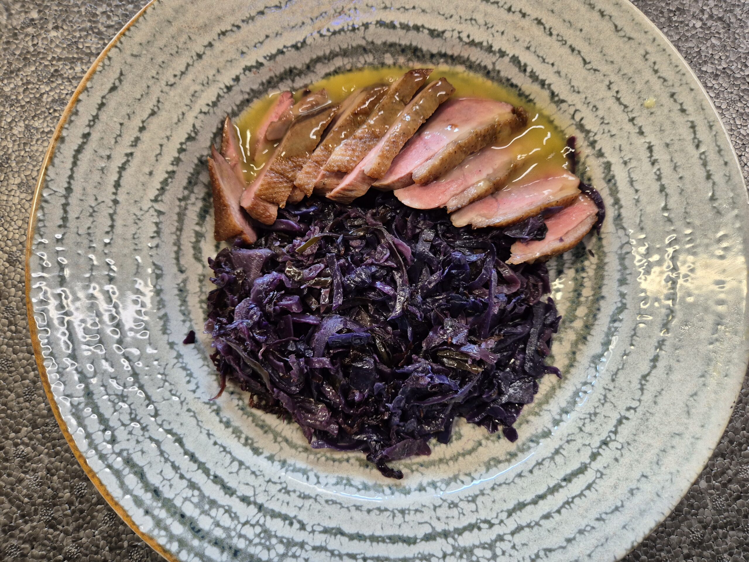 PIEPT DE RATA PE VARZA ROSIE CU SOS DE PORTOCALE (350.00 g)