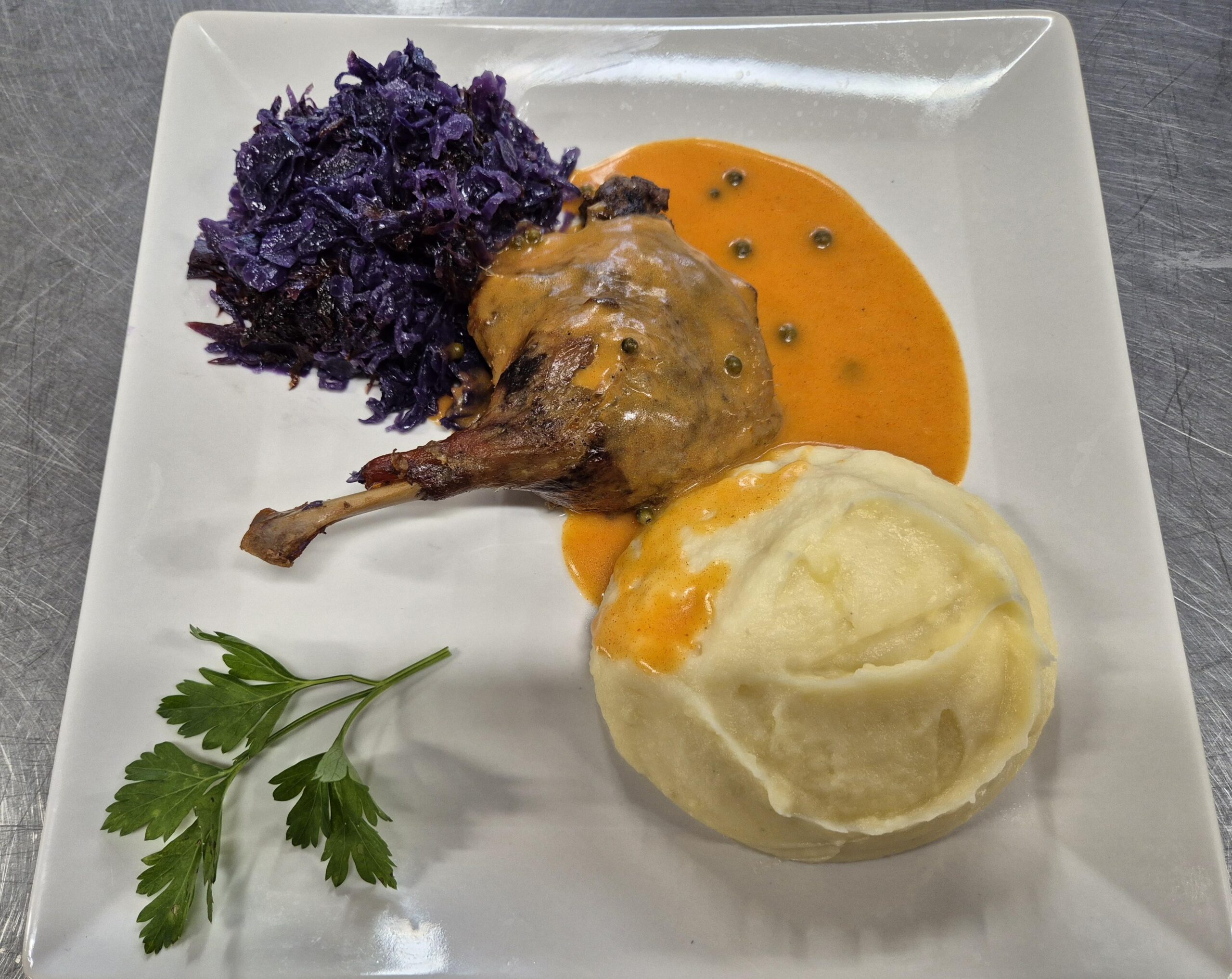 F3 – PULPĂ DE RAȚĂ CU PIURE DE ȚELINĂ ȘI VARZA ROȘIE CĂLITĂ (pulpa rata, telina, cartofi, lapte, unt, varza rosie) 350 gr.