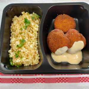 F2 - CHIFTELUȚE DE PUI CU COUȘ-COUȘ ȘI SOS ALB (carne de pui, ou, pesmet couș-couș, brânzeturi, smantana) - 350 gr.23,50 lei