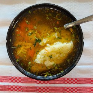 C1 - SUPĂ DE PUI CU GĂLUȘTE DE GRIS (carne de pui, morcovi, telina, patrunjel, gris, oua) - 400 ml.13,00 lei