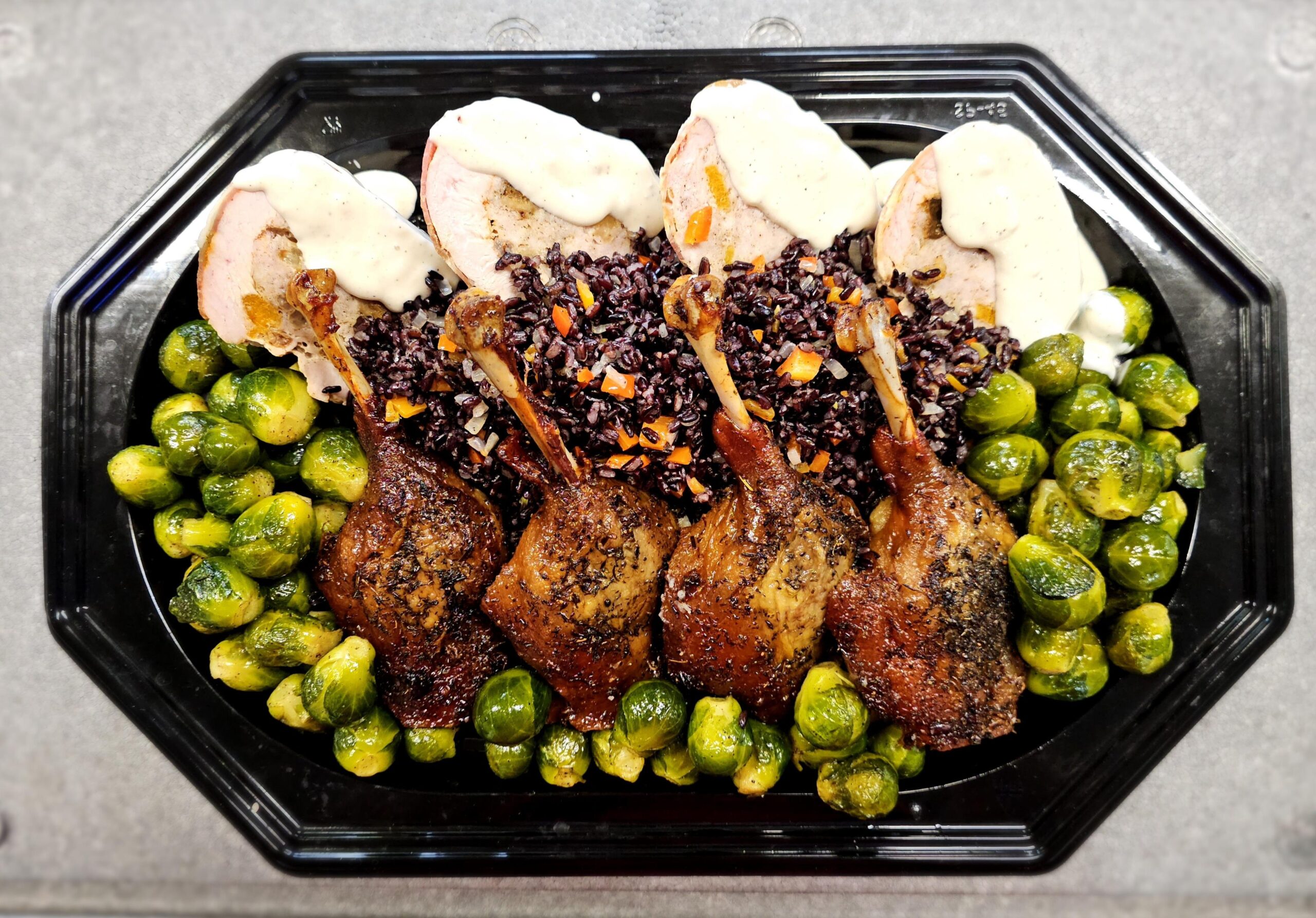 M55 – PLATOU NOBLESSE – 2,2 KG (PLATOU NOBLESSE – pulpă de rață, ruladă de curcan umplut cu fructe confiate, varza Bruxelles, orez brun, sos gorgonzola – RECOMANDAT PENTRU 4 PERSOANE)