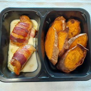F2 - PIEPT DE PUI ÎNVELIT ÎN BACON CU SOS DE BRÂNZETURI ȘI CARTOFI DULCI (piept de pui, bacon, brânzeturi, smantana, faina, cartofi dulci) - 350 gr.