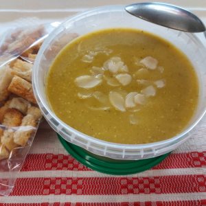 C2 - SUPĂ CREMĂ DE BROCCOLI CU FULGI DE MIGDALE ȘI CRUTOANE (broccoli, ceapa,morcovi, cartofi, smantana vegetala, crutoane, fulgi de migdale, crutoane) - 400ML.