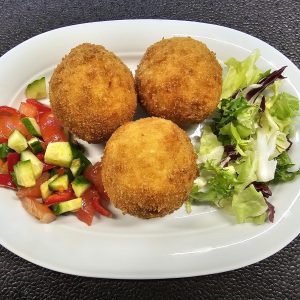 V1 - ARANCINI (GOMBOȚI DE OREZ CU CAȘCAVAL) ȘI SOTE DE MAZĂRE CU MORCOVI (orez basmati, unt, parmesan, pesmet, oua, branzeturi, mazăre, morcovi) - 350 gr.