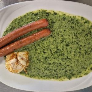 F1 - PIURE DE SPANAC CU OCHIURI ȘI CÂRNĂCIORI (spanac, usturoi, lapte, făină, carnaciori din carne porc, ou) - 350 gr