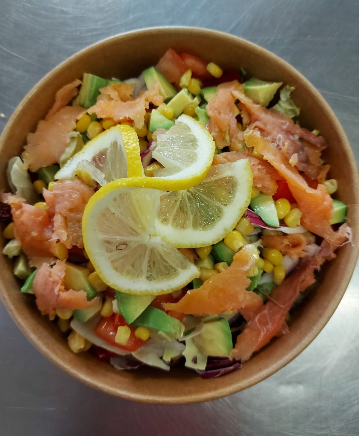 S5 – SALATĂ CU SOMON AFUMAT ȘI AVOCADO (somon afumat, fresh mix de salate, avocado, porumb, roșii, ardei, lămâie, ulei, oțet) – 400 gr.