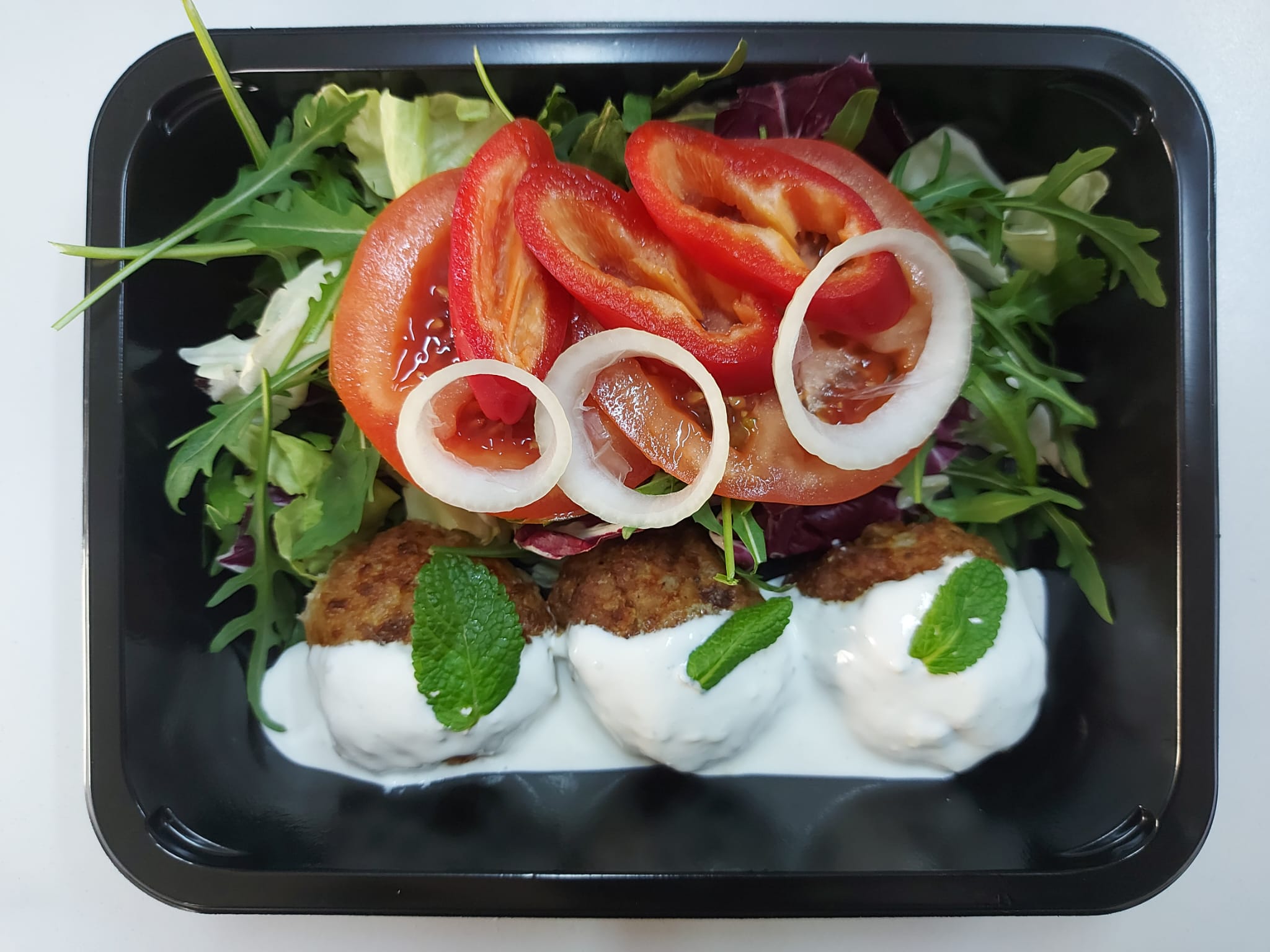 V1 – FALAFEL CU SOS DE IAURT, MENTA SI RUCOLA (naut, ceapa, coriandru, chimen, patrunjel, rucola, rosii, castraveti, ardei, iaurt, maioneza, menta) 350 gr.