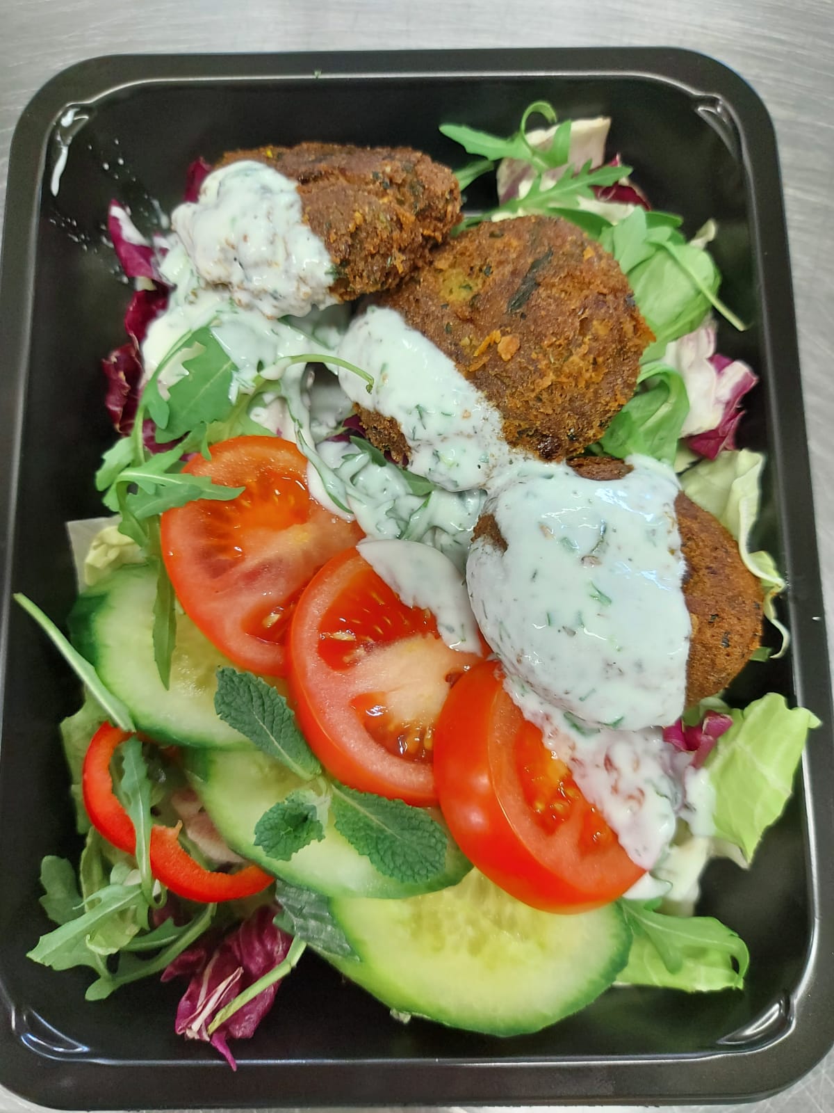 Fii primul care scrii o recenzie pentru „V1 – FALAFEL PE PAT DE SALATE FRESH CU ROȘII, CASTRAVEȚI, ARDEI, SI SOS DE IAURT CU MENTĂ (năut, coriandru, mix de salate, roșii, castraveți, sos de iaurt, mentă) 350 gr.” Anulează răspunsul
