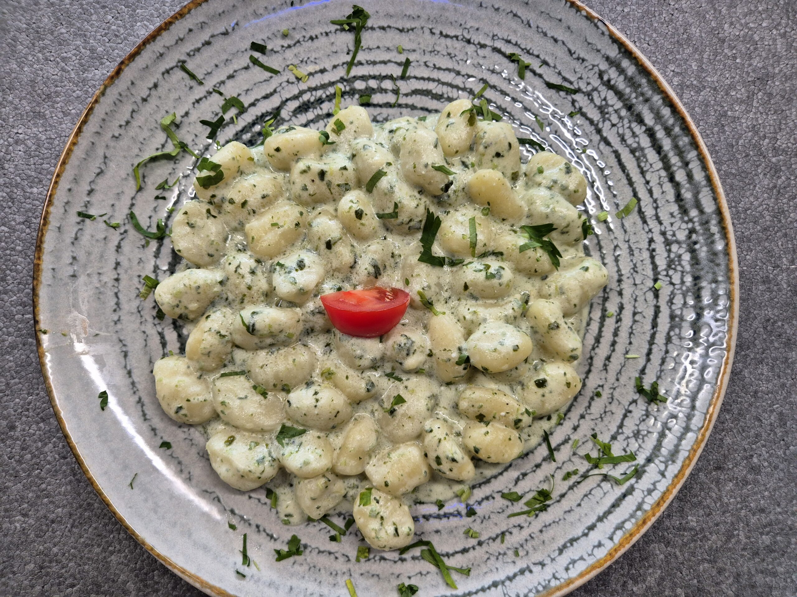 V1 – GNOCHI CU SOS DE BRÂNZETURI ȘI SPANAC (gnochi, spanac, branzeturi diferite, smantana vegetala) – 350 gr