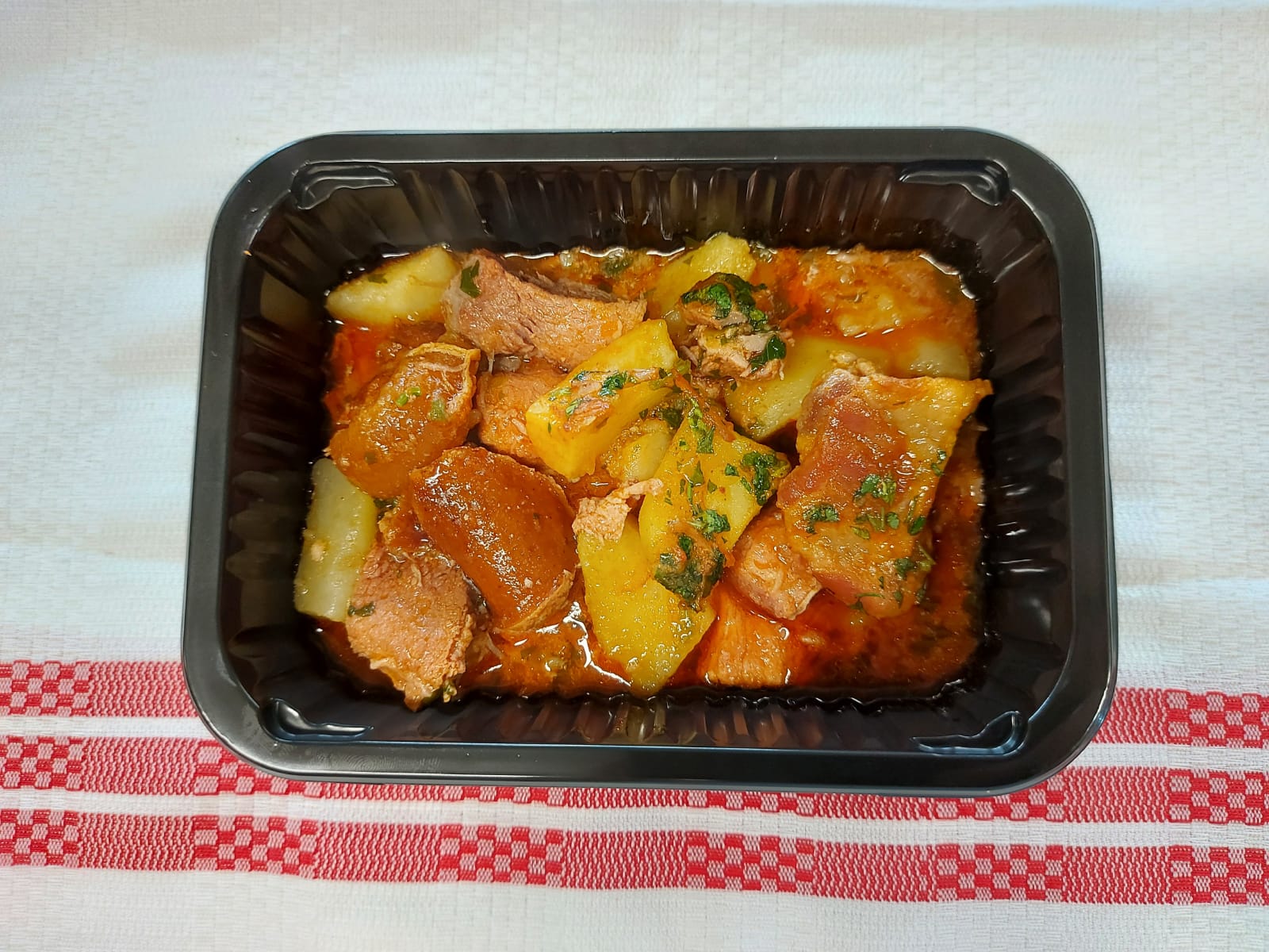 V1 – GULAȘ VEGETARIAN CU CARTOFI (soia, cartofi, ceapa, ardei, chimen, boia) – 350gr.