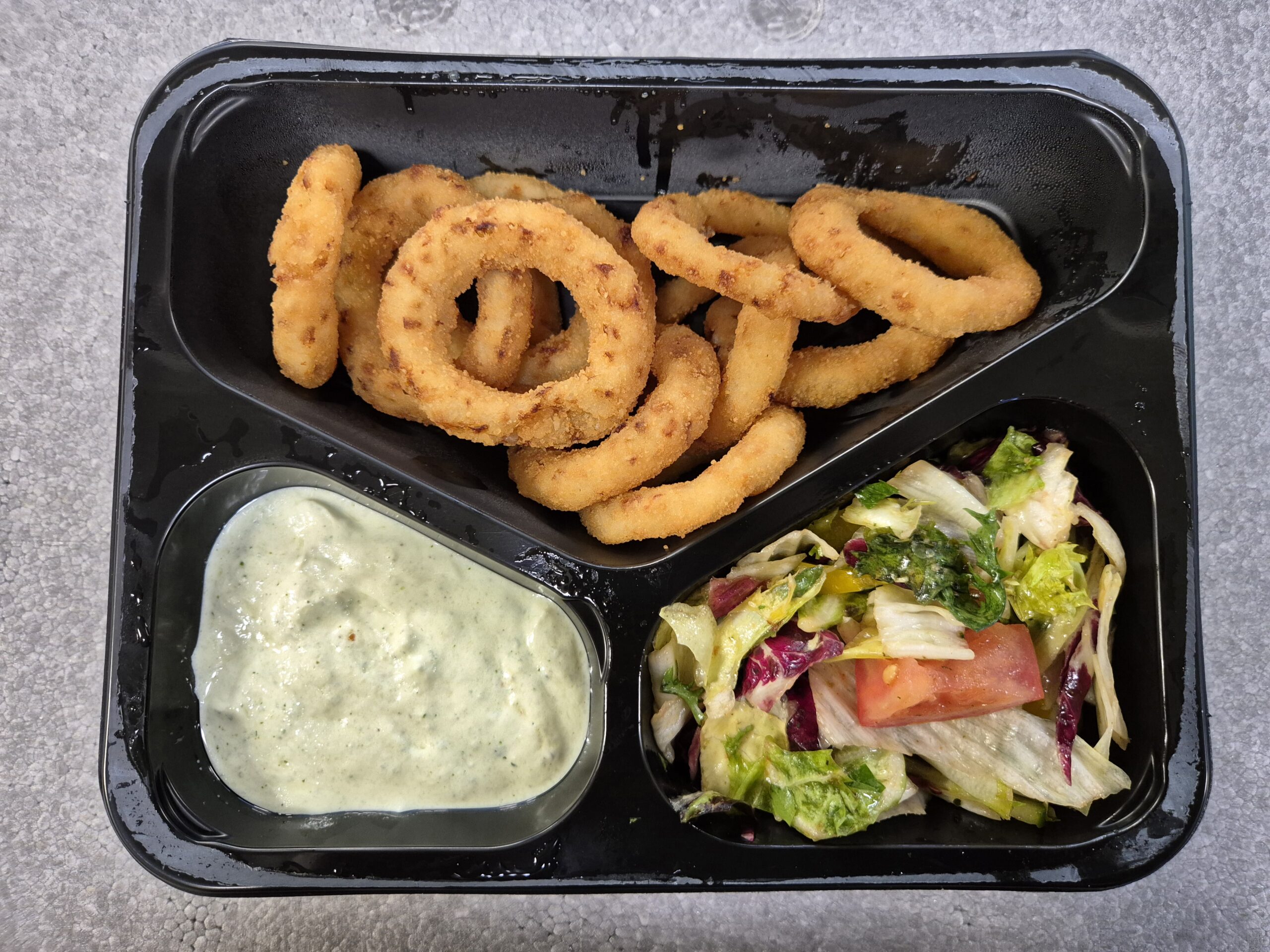 V1 – INELE CROCANTE DE CEAPĂ CU SOS DE IAURT ȘI MIX DE SALATE (inele ceapa, iaurt, menta, mix de salate) – 350 gr