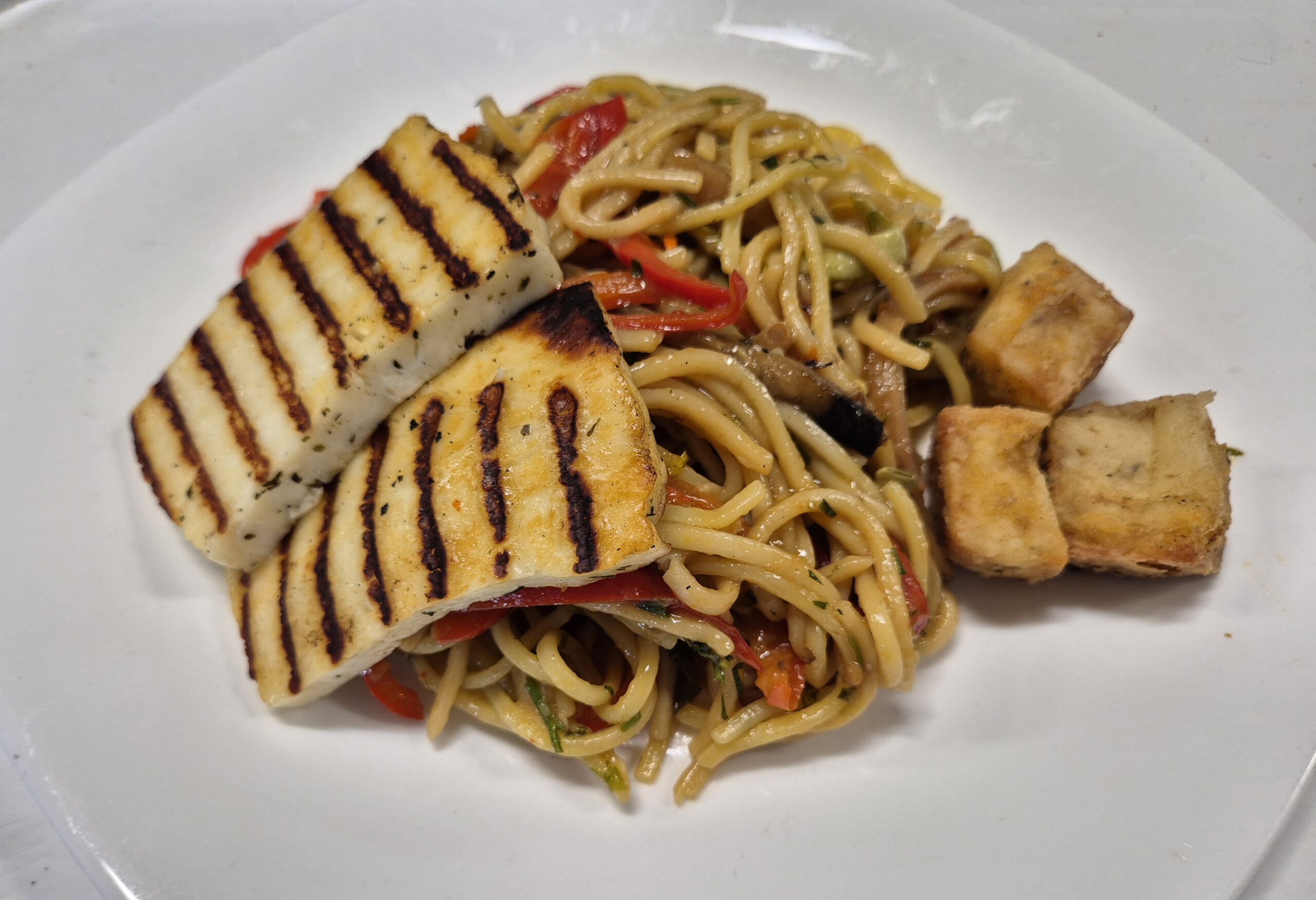 V1 – NOODLES CU LEGUME ȘI HALLOUMI LA GRĂTAR (noodles, dovlecel, ardei, ceapă, vinete, halloumi, sos soia) 350 gr.