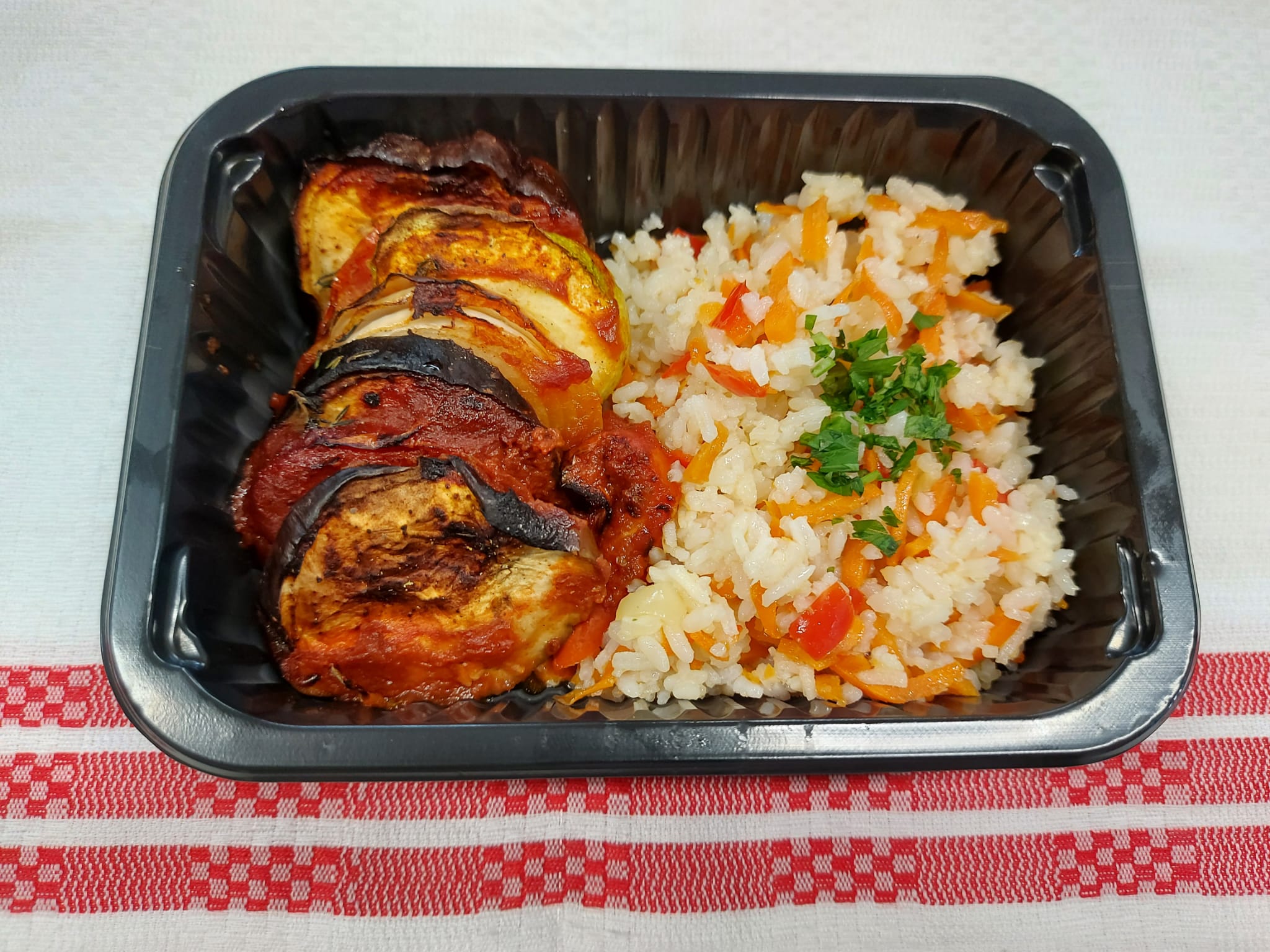 V1 – RATATOUILLE CU OREZ – DE POST (dovlecei, ardei, vinete, ceapa, rosii, orez, ierburi aromatice) – 350gr.